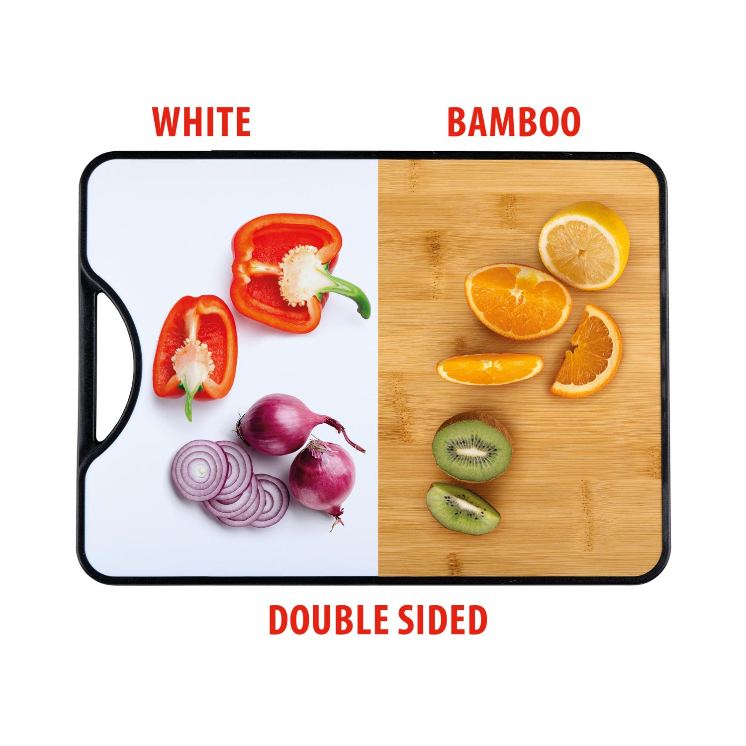 - Dubbelzijdig ontwerp: Gebruik de bamboezijde voor droog voedsel zoals brood en kaas, en de kunststofzijde voor vochtig voedsel zoals groenten of vlees.