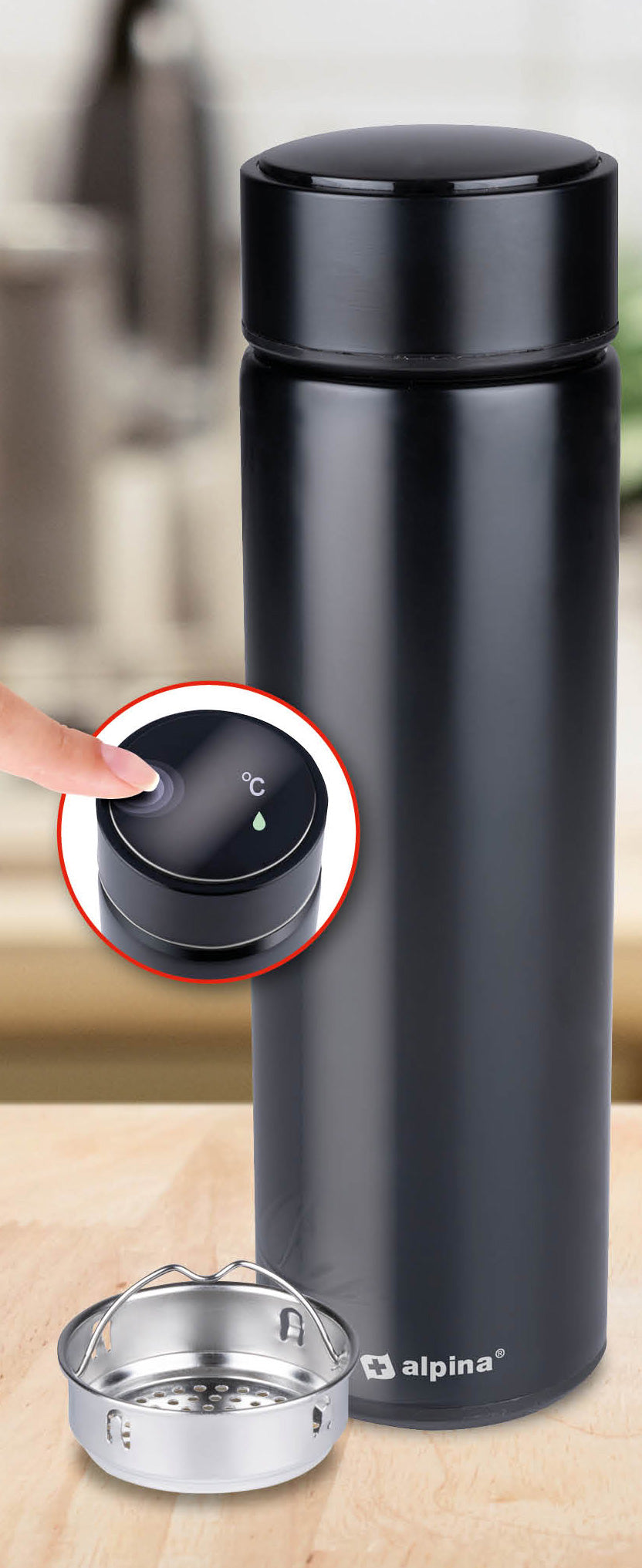 Vind jij normaal water soms wat saai en drink je daarom te weinig? Of wil je de hele dag door van je favoriete thee smaak kunnen genieten? Het kan met de alpina digitale thermosfles. Direct na het openen van de thermofles vindt je een SUS304 filter. Dit roestvrij stalen filter maakt het mogelijk om bijvoorbeeld fruit of een theezakje aan de bovenzijde van de isoleerfles toe te voegen. Hierdoor kun je op een makkelijke manier meer smaak toevoegen aan je thee of water en blijf je de hele dag door gehydrateerd. Daarnaast kun je door fruit inplaats van ranja of aanmaak toe te voegen aan je water ook je dagelijkse suikerinname drastisch verlagen.