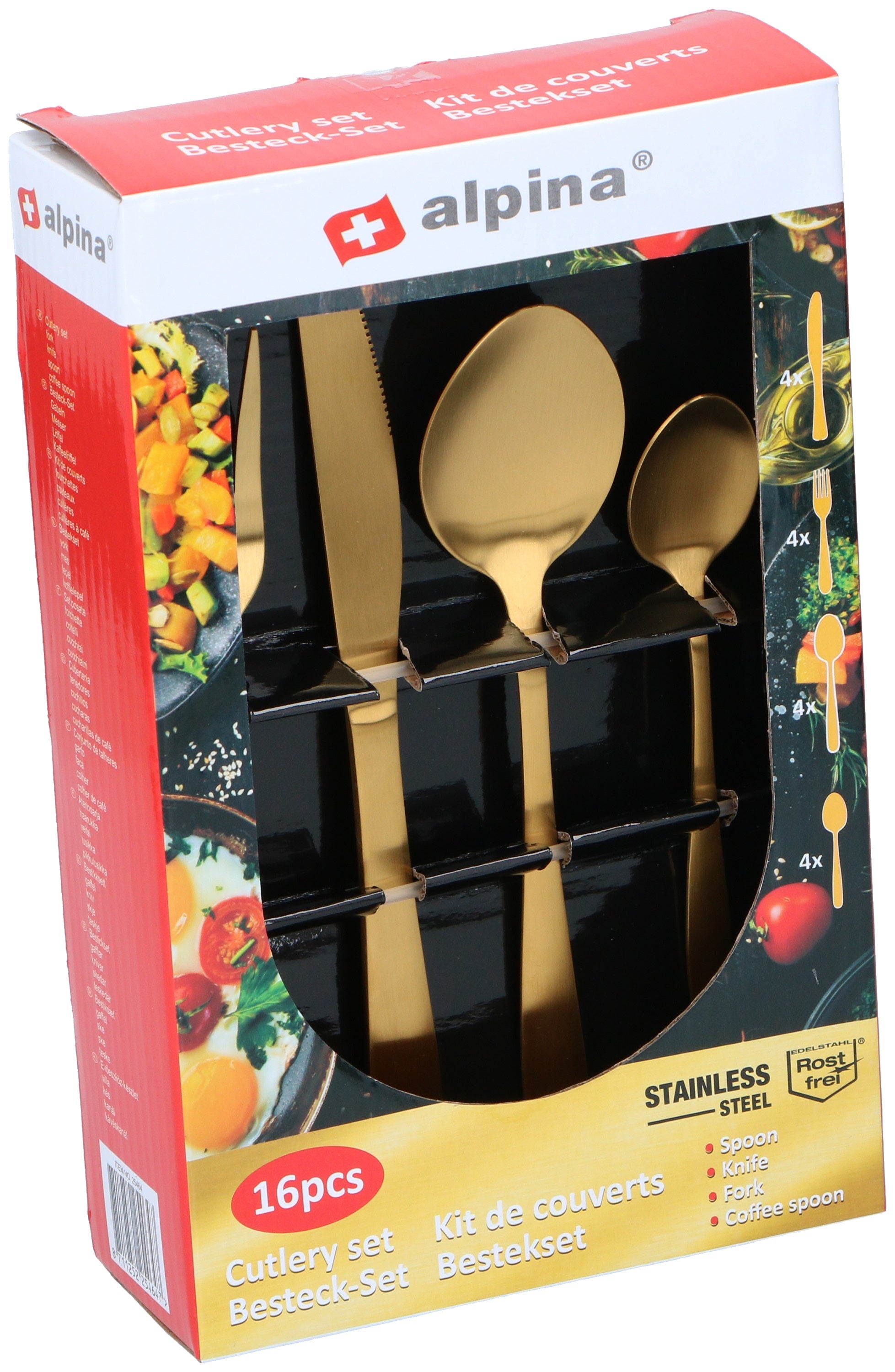 Deze supermooie bestekset van kwaliteitsmerk alpina is gemaakt van oersterk roestvrij staal. Door het minimalistische design met een mat gouden effect staat dit bestek mooi op een modern gedekte tafel en bij een dito servies.