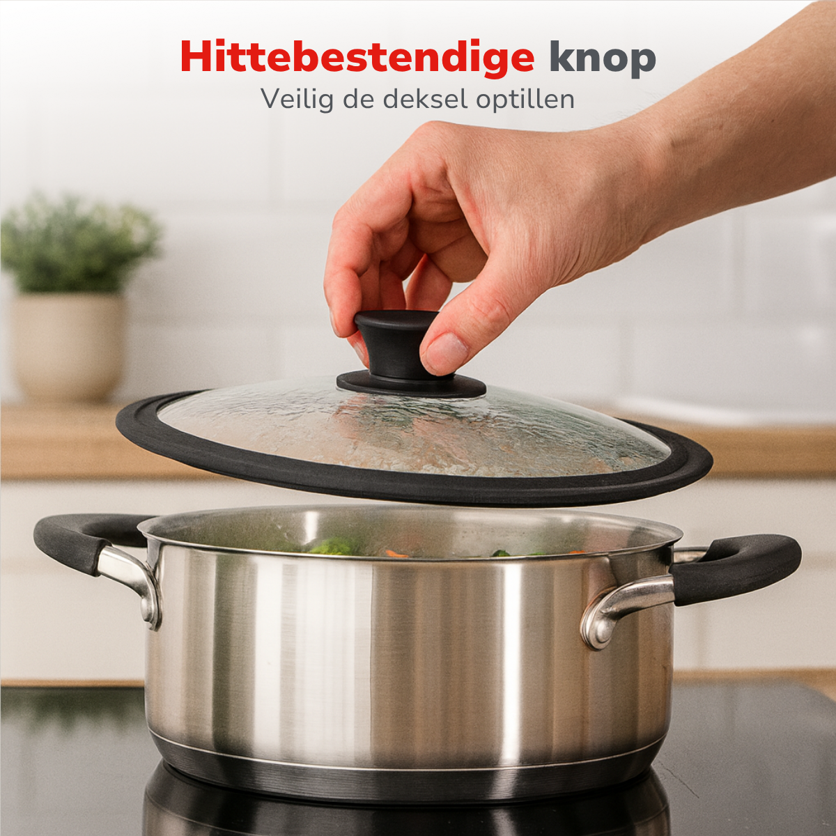 Koken was nog nooit zo makkelijk als met deze universele glazen pannendeksel van alpina. Deze veelzijdige universele deksel is ontworpen om perfect te passen op pannen met een diameter van 24, 26 en 28 centimeter, waardoor hij vrijwel op elke pan in je keuken past. Een van de opvallende kenmerken van deze pannendeksel is de ingebouwde siliconenrand. Deze rand zorgt niet alleen voor een stevige en veilige pasvorm op je pannen, maar heeft ook een isolerende werking. Hierdoor blijft de hitte optimaal behouden, wat resulteert in snellere kooktijden en energiebesparing. Geen gedoe meer met overtollig vocht of ongewenste spetters tijdens het koken, want de deksel houdt alles netjes onder controle.
