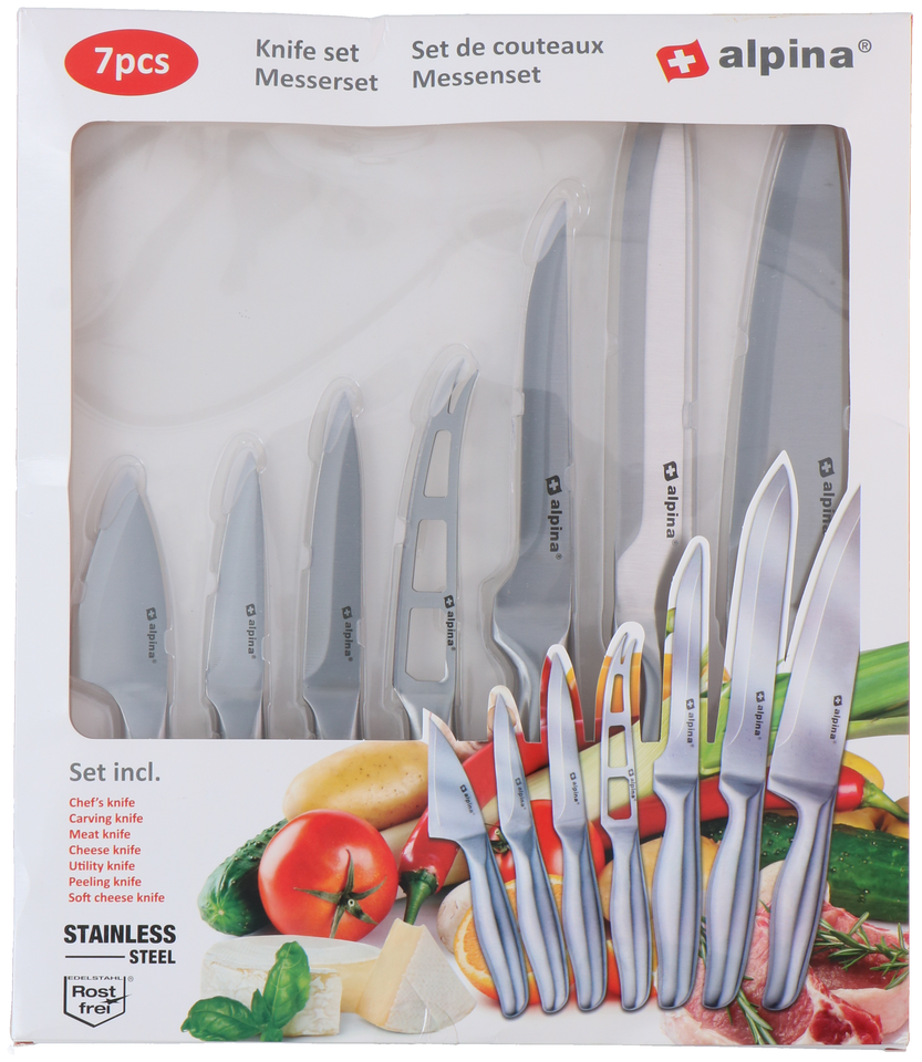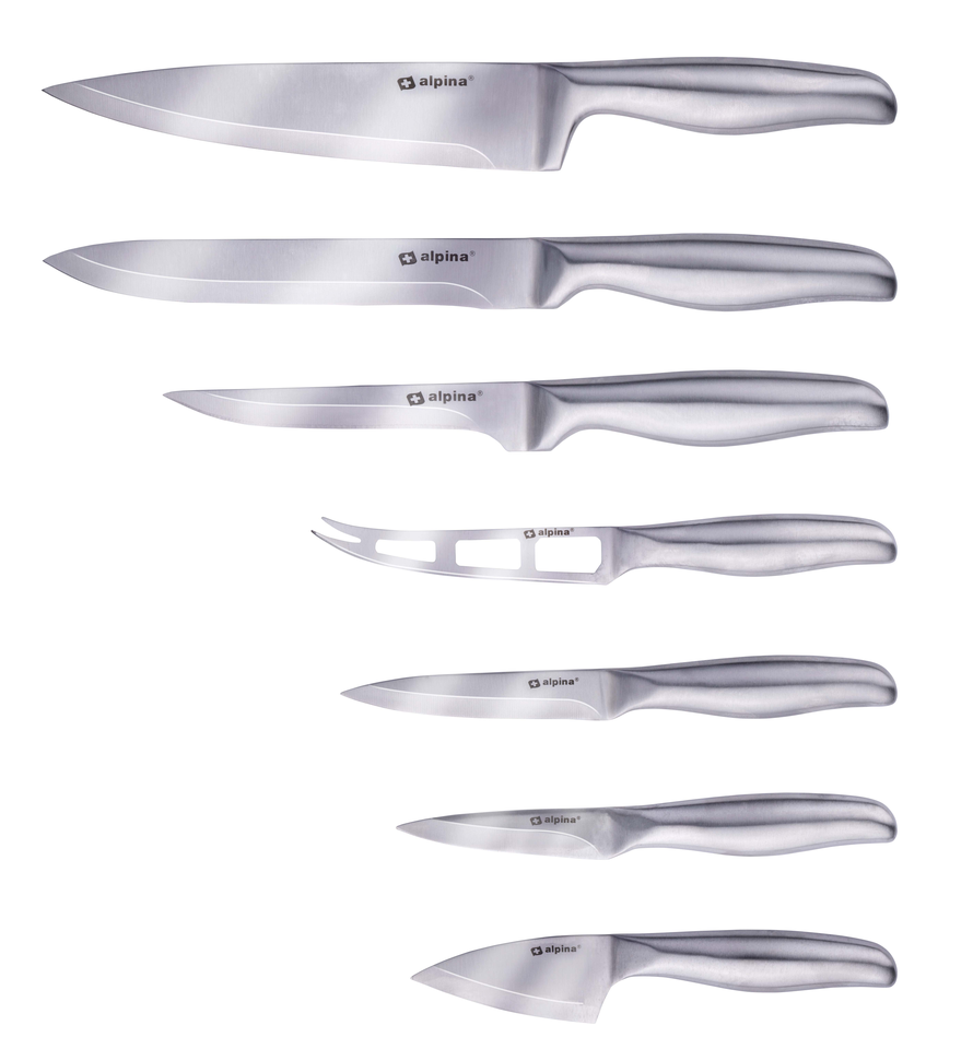 Op zoek naar een messenset voor allerlei verschillende soorten doeleinden? Deze messenset van alpina bevat 7 verschillende messen, waaronder een koksmes, vleesmes, kaasmes en schilmes. Je kunt er dus alle kanten mee op. De messen zijn allemaal vervaardigd uit roestvrijstaal, hierdoor kunnen ze veilig in de vaatwaser zonder te beschadigen.