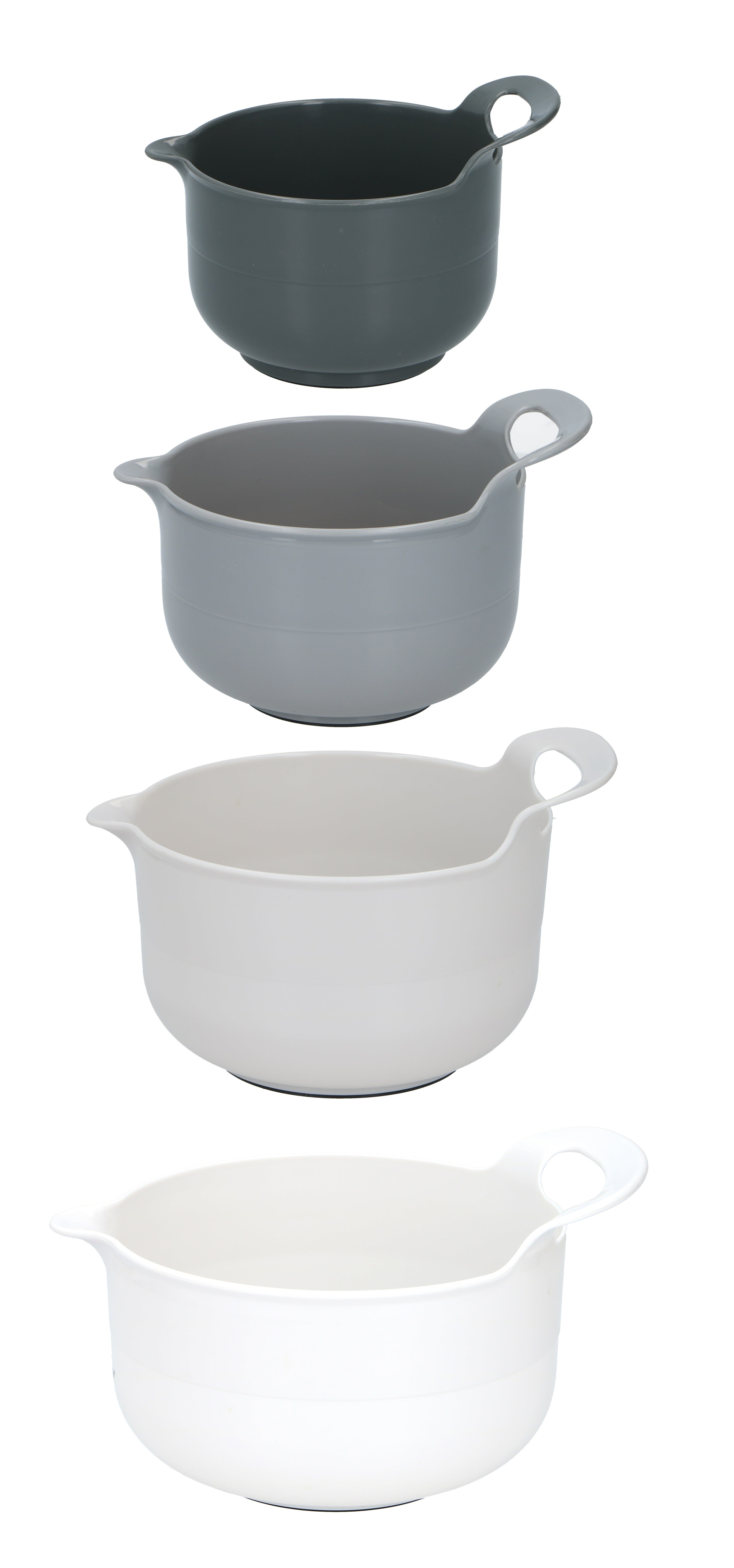 Elke beslagkom is voorzien van een anti-slipring aan de onderkant zodat hij keurig op het aanrecht blijft staan terwijl je aan het mixen of kloppen bent. De mengkommen passen netjes op volgorde van grootte in elkaar dus opbergen gaat gemakkelijk en compact. Qua vormgeving en de uitvoering in wit en verschillende grijstinten passen ze in elke moderne keuken.