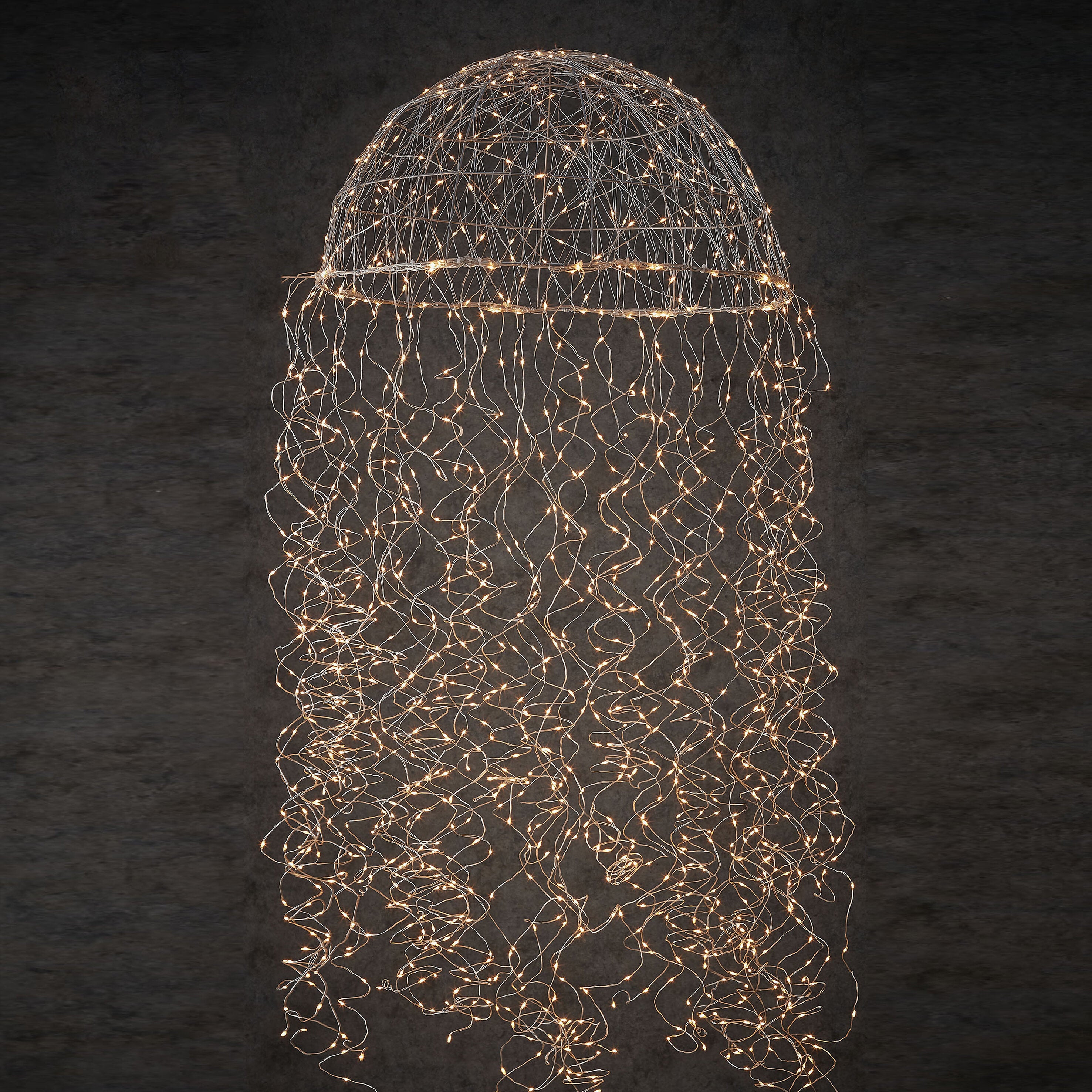 Met deze kerstverlichting uit de collectie van Luca Lighting maak je het ook buiten in no time gezellig. Het ronde, metalen frame met daaraan meerdere lichtsnoertjes zorgen ervoor dat de kroonluchter de vorm van een kwal krijgt. In totaal telt de hanger maar liefst 1280 kleine, warm witte LED lampjes. De verlichting is spatwaterdicht, dus ook tijdens een regenbui kun je hem met een gerust hart buiten laten hangen, maar hij is ook leuk voor onder een afdakje! De kroonluchter is 2 meter lang en heeft een diameter van 60 cm.