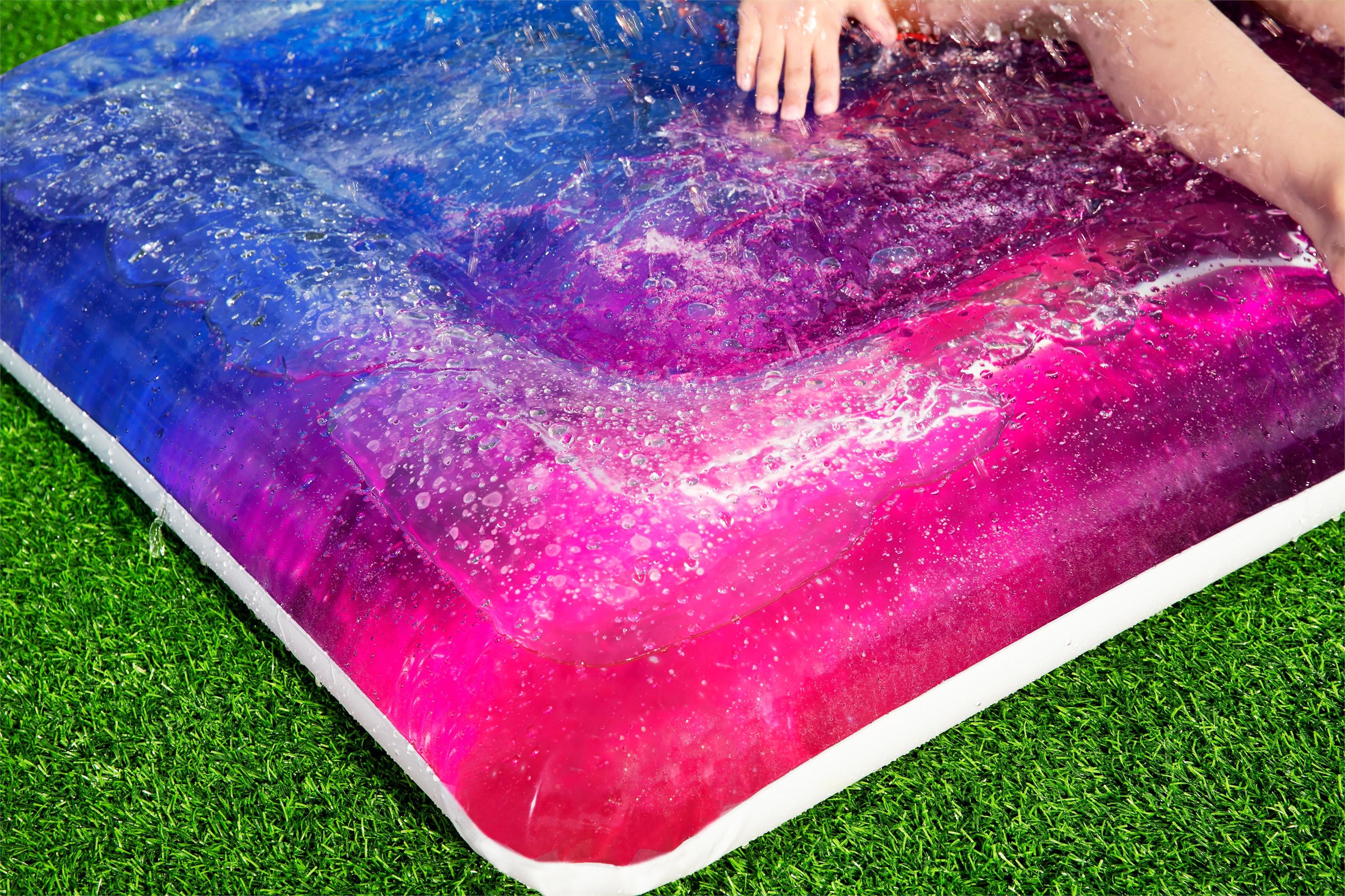 Je zet het Bestway waterkussen snel en eenvoudig op. Haal de mat uit de verpakking en plooi hem voorzichtig open. Sluit de waterspeelmat vervolgens aan op een tuinslang. Je dient de mat niet op te blazen, maar simpelweg te vullen met water via de tuinslang. Hoe meer waterdruk zich opbouwt in het kussen, des te meer water er uit de sproeigaatjes zal komen. Dit staat garant voor uren aan speelplezier. In totaal gaat er maximaal 110 liter in het waterkussen. Je kunt dit unieke stukje waterspeelgoed daarnaast zowel binnen als buiten gebruiken. Het water op de watermat wordt via een mondstuk aan de bovenzijde van de mat afgevoerd.