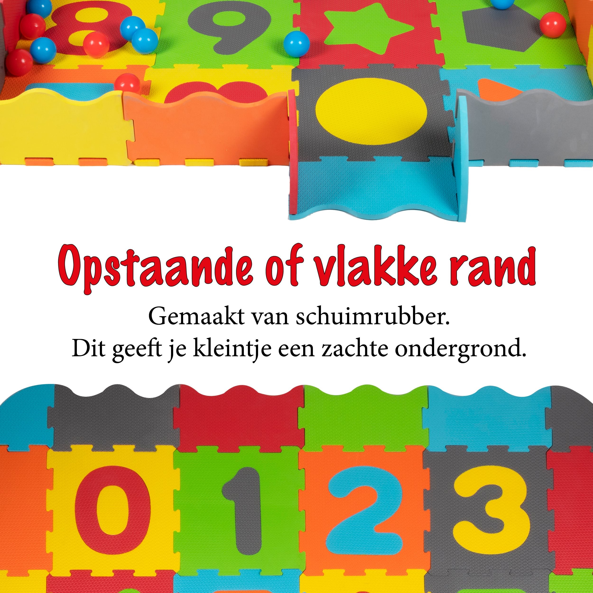 Deze grote speelset voor baby's en peuters is een combinatie van speelmat, puzzel en ballenbak. De mat is zo'n 146 x 146 centimeter groot en is gemaakt van schuimrubber. Dat vormt een zachte ondergrond voor je kleintje. De speelmat bestaat uit kleurrijke puzzelstukken, deels met cijfers en vormen, die eruit kunnen. Zo kun je ook echt puzzelen met deze mat. Bij de set zitten verder maar liefst 40 speelballen. De rode en blauwe ballen hebben een doorsnee van zo'n 6 centimeter en zijn dus groot genoeg voor kleintjes om mee te spelen.