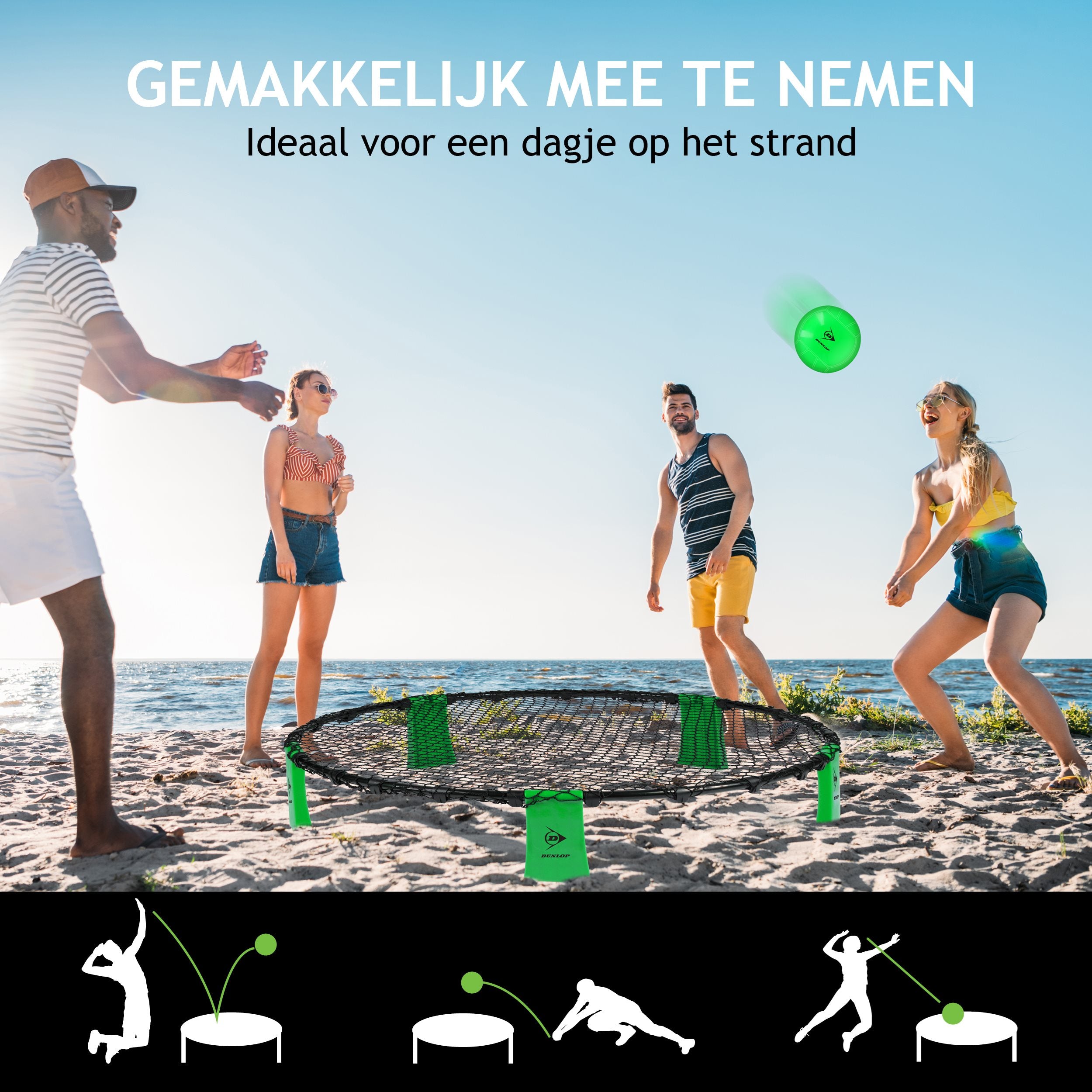 Het Dunlop spyderball spel wordt als complete set geleverd. In de set vindt je het frame bestaande uit 5 stukken, 5 poten, het roundnet, een bal, een pomp om de bal mee op te pompen en een handige draagtas. Montage is snel en zeer gemakkelijk, maar moet wel onder toezicht van een volwassene gebeuren. Wanneer je de slam ball set niet gebruikt kun je hem het beste afbreken en veilig opbergen in de bijgeleverde reistas zodat hij zo lang mogelijk mee gaat. In deze reistas kun je de spyderball set ook gemakkelijk meenemen naar een middag in het park, een dagje aan het strand en zelfs op vakantie. Dankzij de afmetingen van 90 x 20 centimeter kun je spyderball ook binnen spelen, mits daar voldoende ruimte voor is.