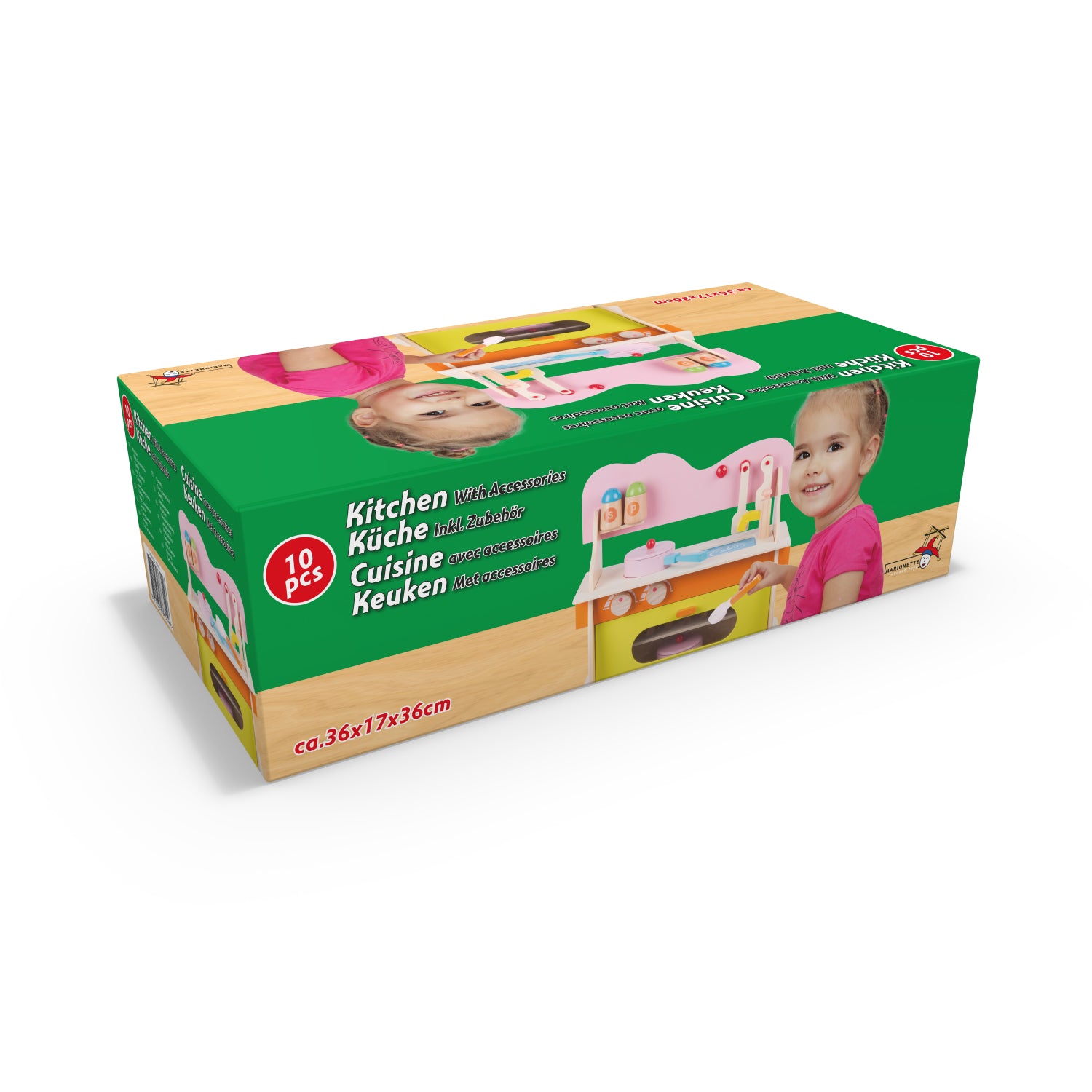 Verder is het speelkeukentje uitgerust met 3 haken voor keukengerei en 1 plankje. Je krijgt er een uitgebreide set accessoires bij die bestaat uit 2 pannen, 1 peper- en zoutstel, 1 lepel, 2 spatels en 1 ei.