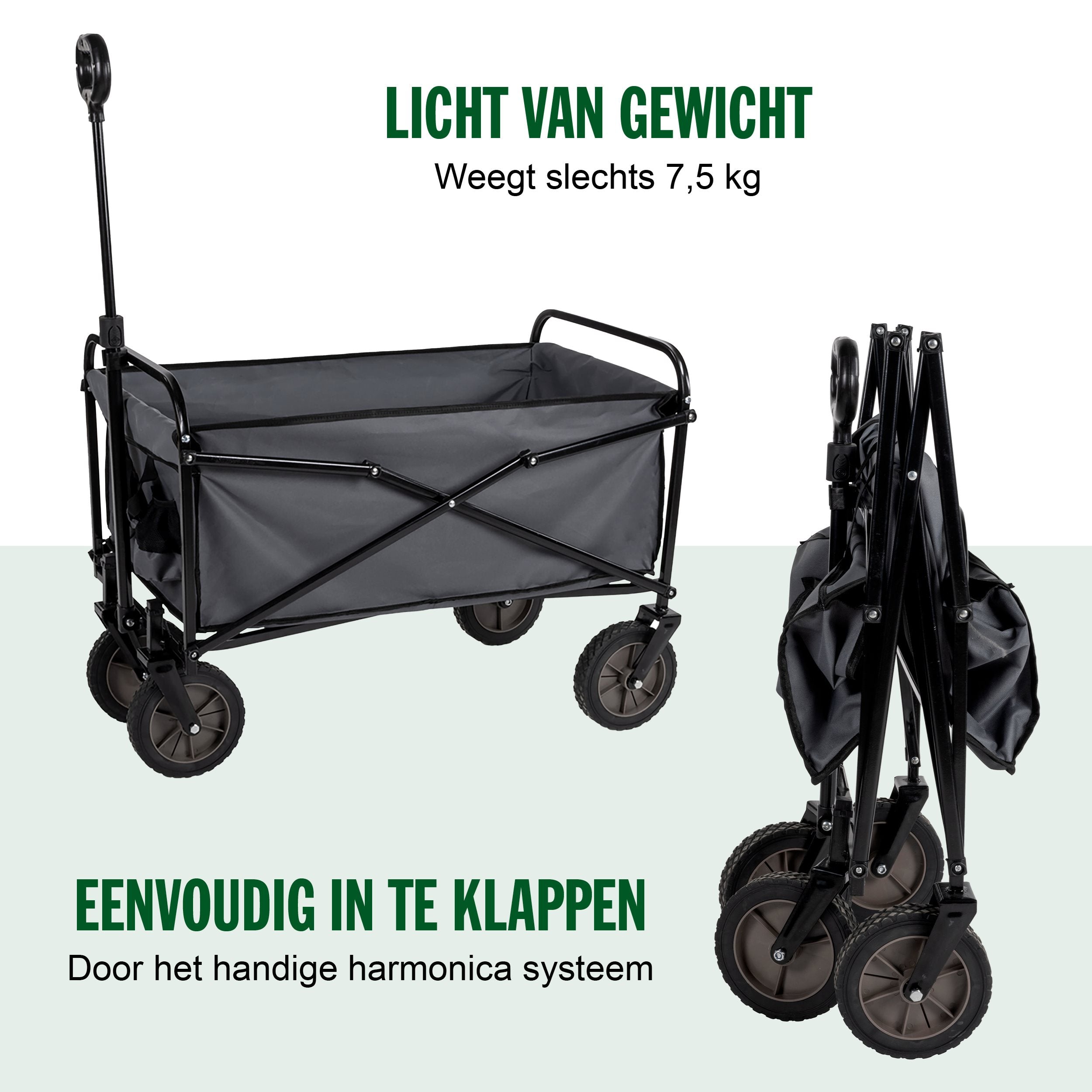 De bolderkar is makkelijk opvouwbaar en daarom makkelijk op te bergen als je hem niet gebruikt. Door het handige harmonica systeem is het op- of uitvouwen in een handomdraai geklaard. Ook past hij makkelijk in de auto waardoor deze kar uiterst geschikt is als je bijvoorbeeld een dagje naar het strand gaat. Je neemt de kar eenvoudig overal mee naartoe.