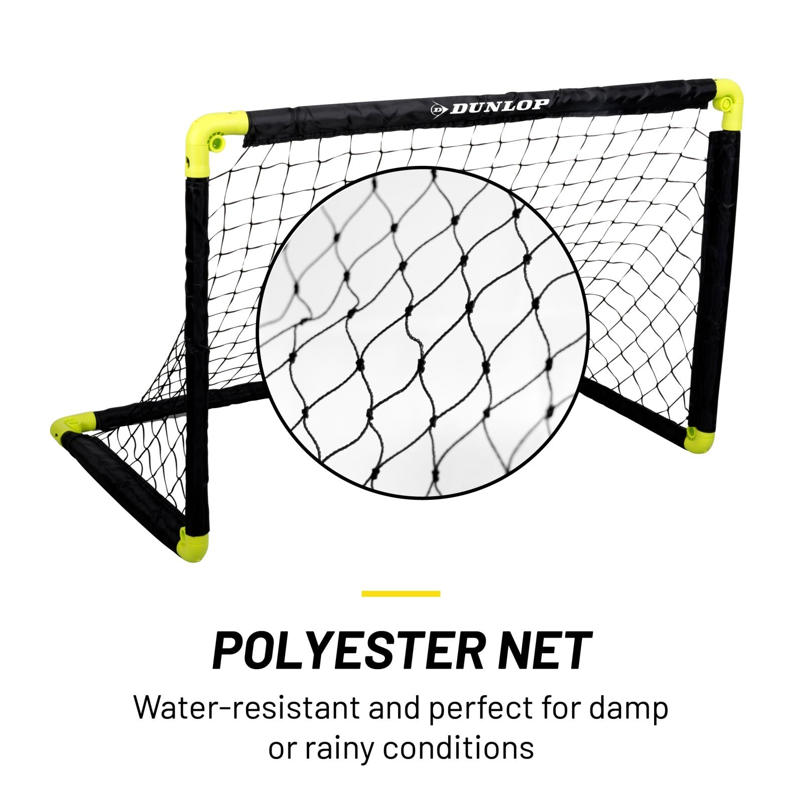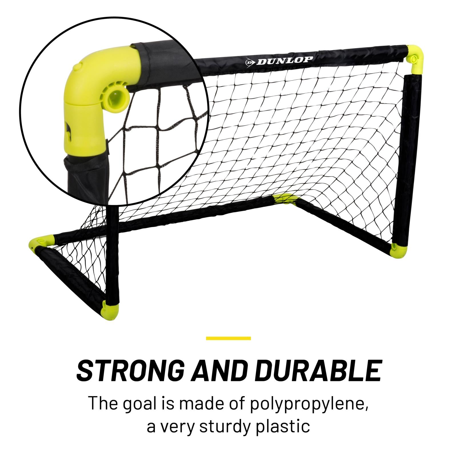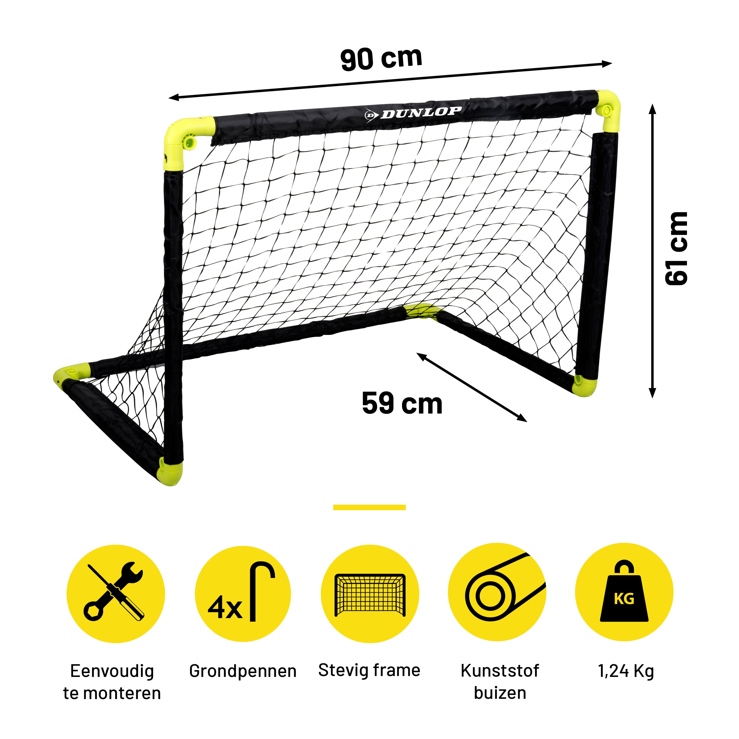 Het Dunlop voetbaldoel heeft een afmeting van 90 x 59 x 61 centimeter. Hierdoor is het doel zeer compact en kun je hem zowel binnen als buiten gebruikten. Voor voetbal training is het goaltje perfect voor alle leeftijden. Oefen op je goaltrap, de hoek waarin je een penalty zou kunnen nemen en andere voetbalskills die op het veld zeker van pas zullen komen. Het voetbaldoel is gemaakt van polypropyleen, een stevige soort kunststof dat zelfs de hardste doelpogingen aan kan.