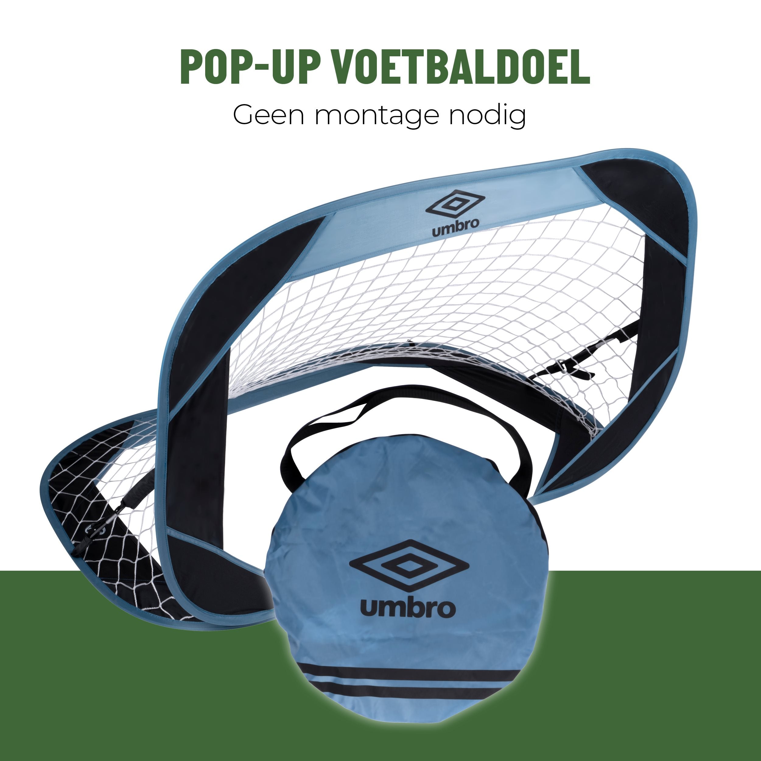 Het fijne aan de Umbro voetbalgoal is dat deze ontworpen is met een speciaal pop-up ontwerp. Dit betekent dat het doel geen montage nodig heeft. Je haalt hem simpelweg uit de verpakking, vouwt hem open en voíla: het goaltje is klaar om gebruikt te worden. Dankzij dit pop-up ontwerp en de meegeleverde reistas kun je het voetbaldoel overal gemakkelijk mee naartoe nemen. Denk bijvoorbeeld aan het park, strand, de speelplaats of het dorpsplein waar je met alle leeftijdsgenoten uit de buurt een voetbalwedstrijd kunt houden. Daarnaast is het Umbro voetbaldoel natuurlijk ook perfect om mee te nemen op vakantie, zodat je zelfs dan aan je voetbal skills kunt blijven werken.