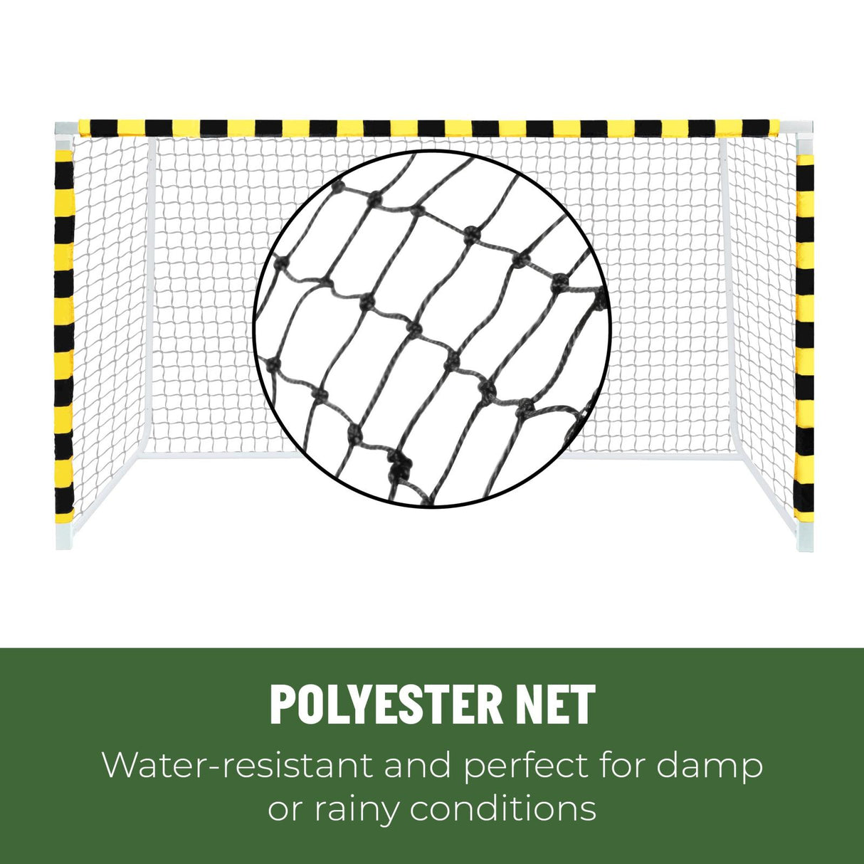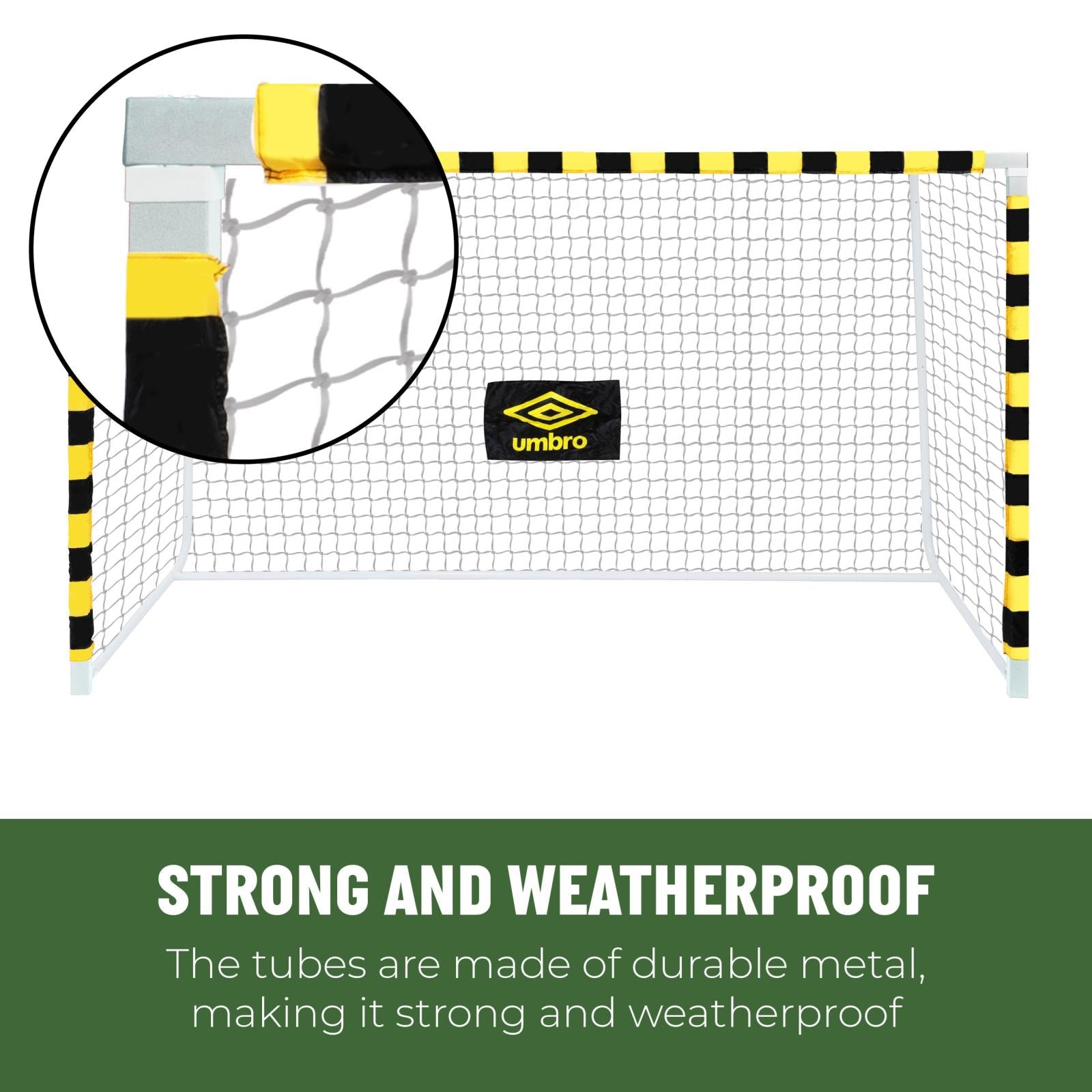 Daag al je vrienden en familie leden uit voor een potje voetbal in de achtertuin met dit ruime voetbaldoel van Umbro. Met zijn ruime afmetingen van 300 x 200 x 110 centimeter is de goal het perfecte voetbaltrainingsmateriaal voor spelers in verschillende leeftijdsgroepen. Dankzij het frame van metaal is het voetbaldoel zeer stevig en zelfs weersbestendig waardoor je hem het hele jaar door buiten kunt laten staan. Door middel van een klik-systeem zet je de goal makkelijk en snel in elkaar. Veranker hem vervolgens met de 7 meegeleverde grondhaken aan de bodem.