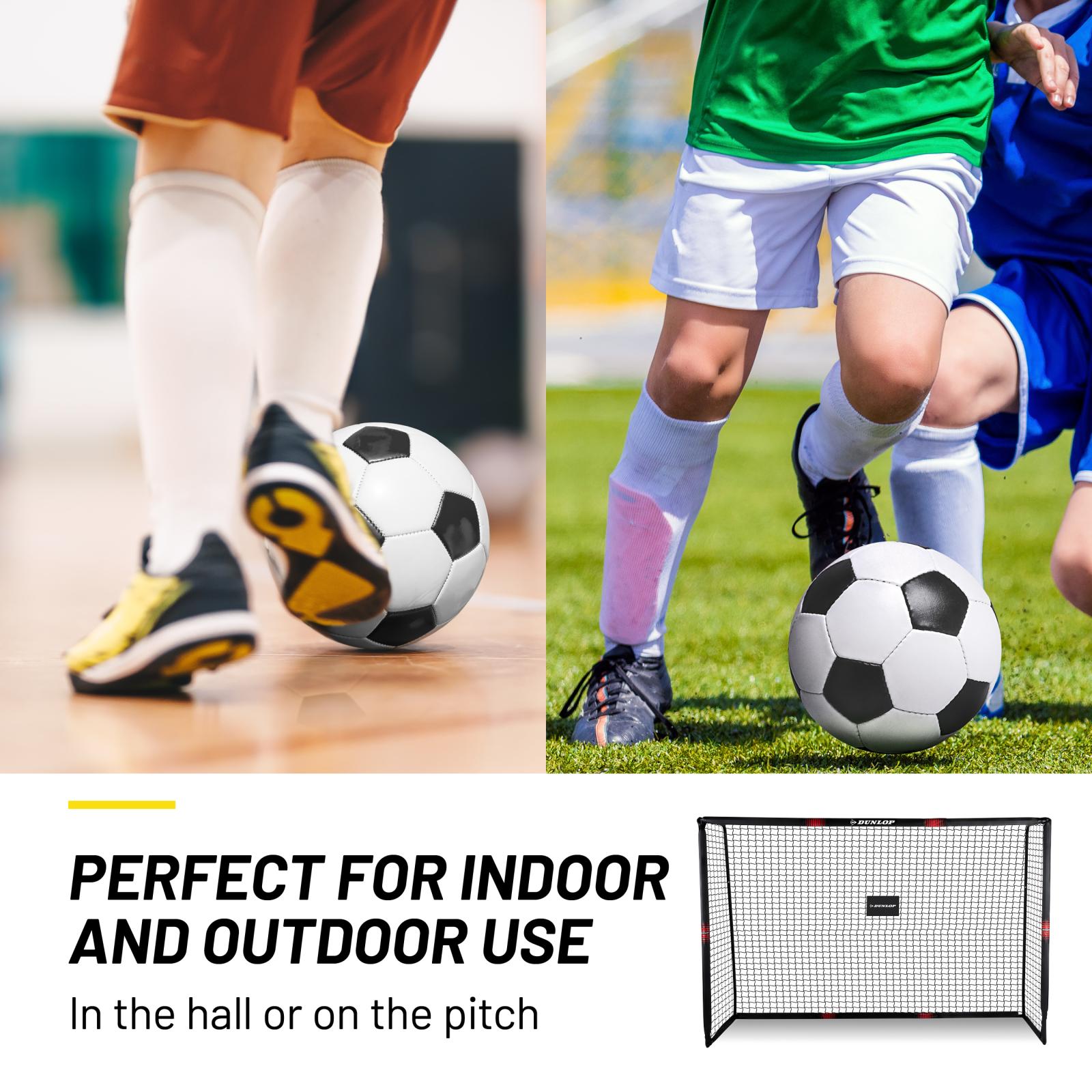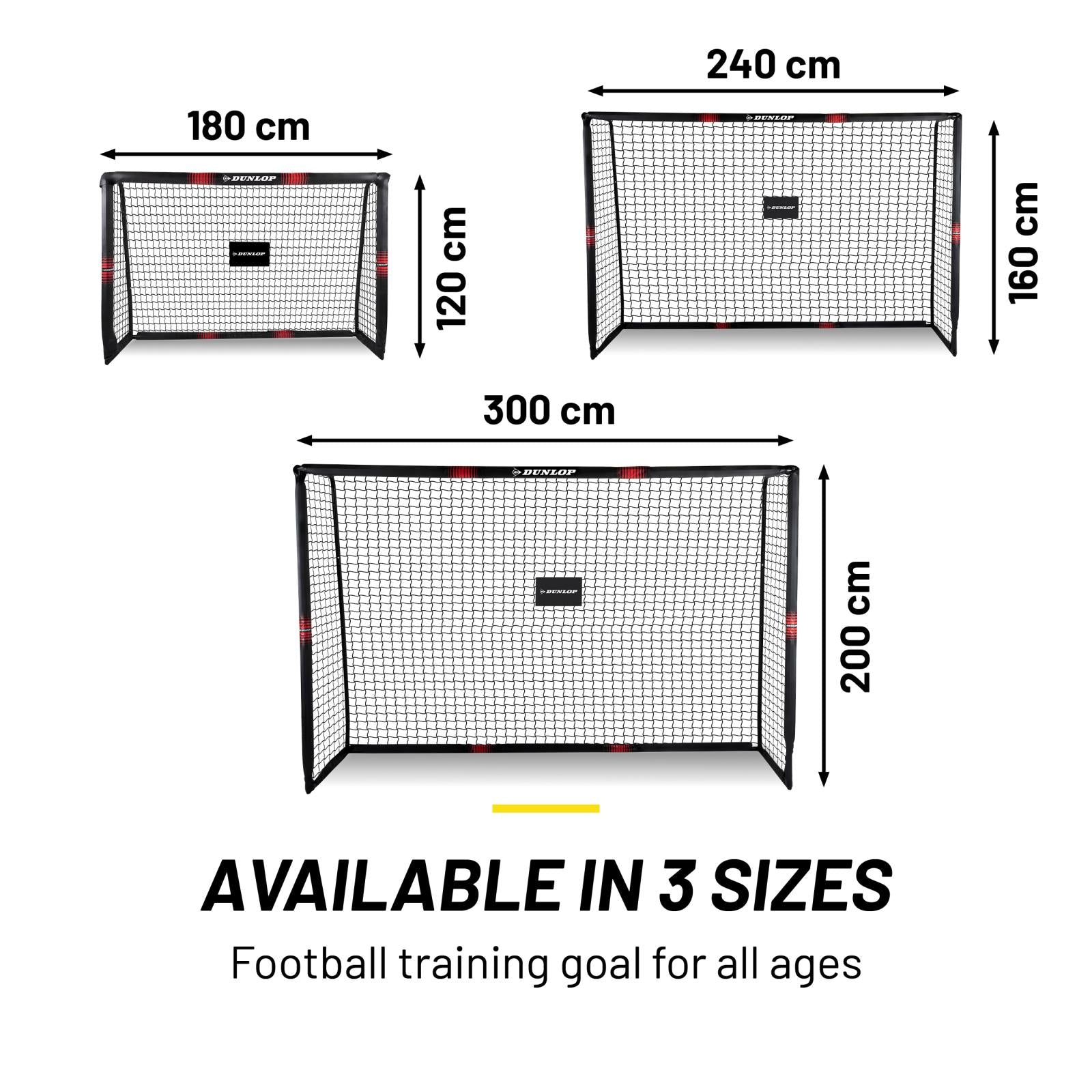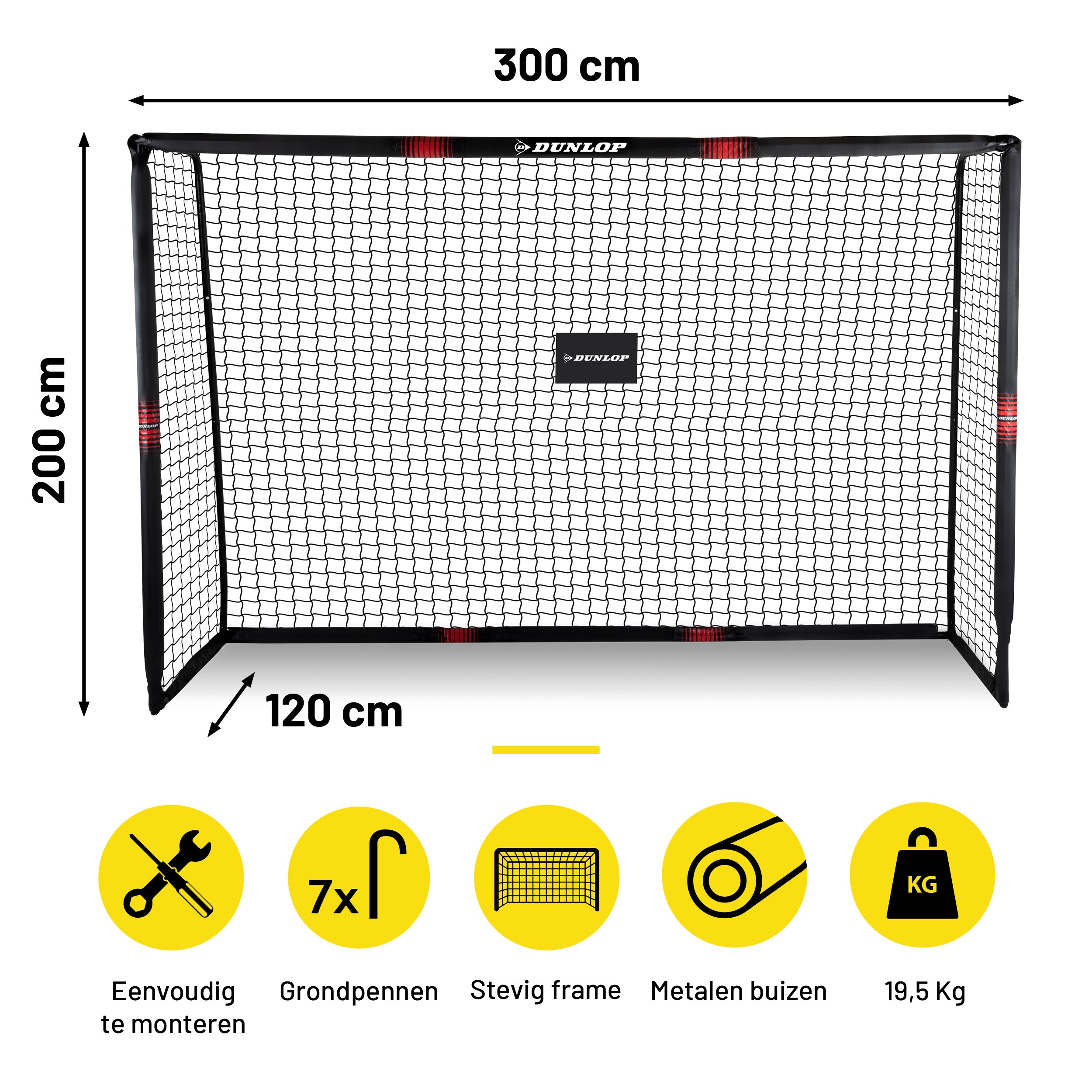 Het metalen voetbaldoel van Dunlop heeft een ruime afmeting van 300 x 200 x 120 centimeter. Hiermee is de goal het perfecte voetbal trainingsmateriaal voor voetballers van alle leeftijden. Werk aan je keeper skills, perfectioneer doeltrappen en penalties of train op nieuwe trucs die je vervolgens op het voetbalveld kunt gebruiken om indruk te maken op zowel de tegenstanders als toeschouwers.