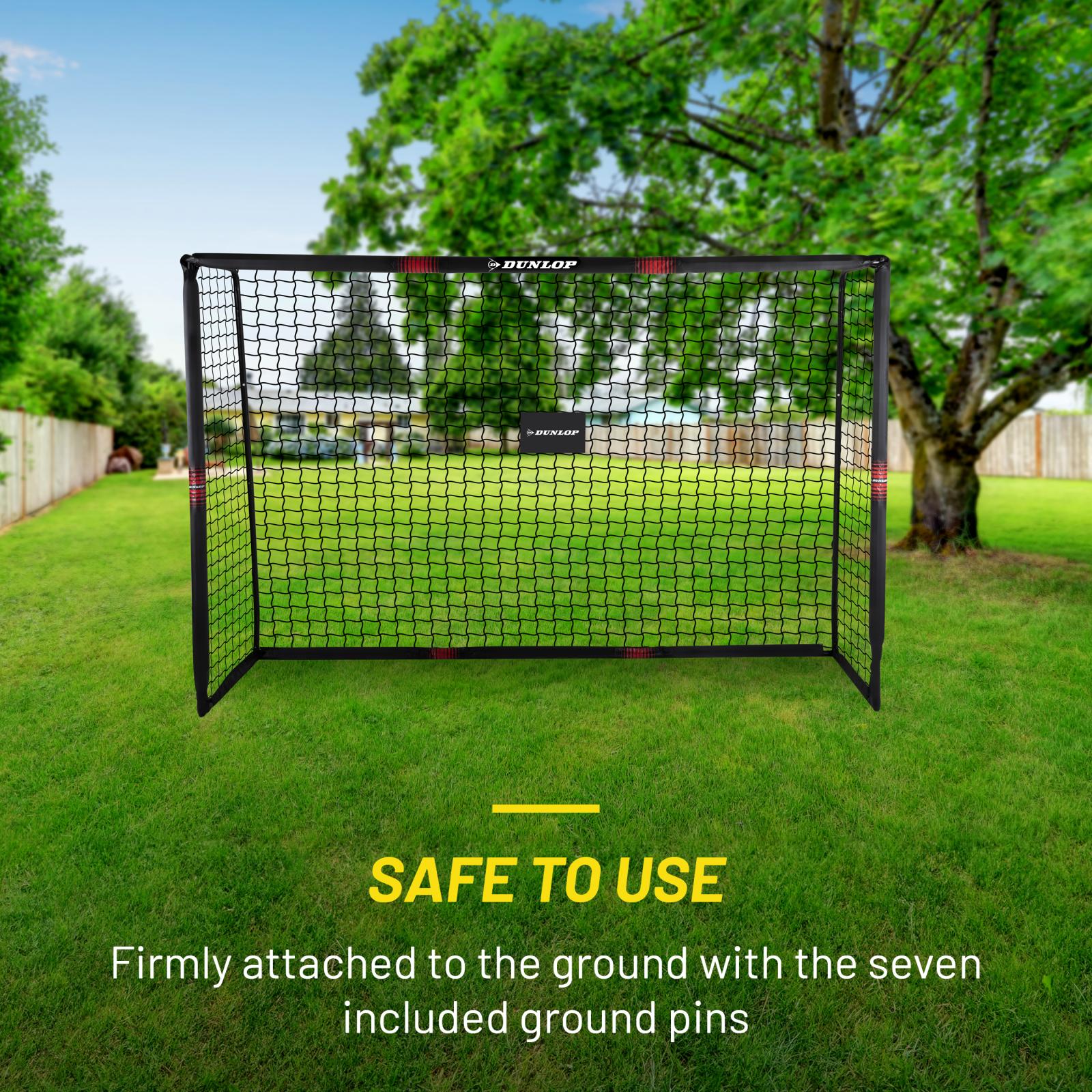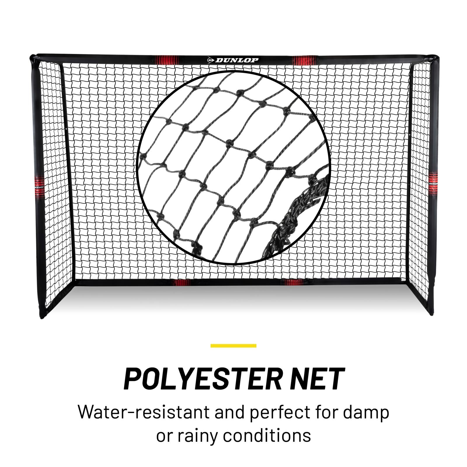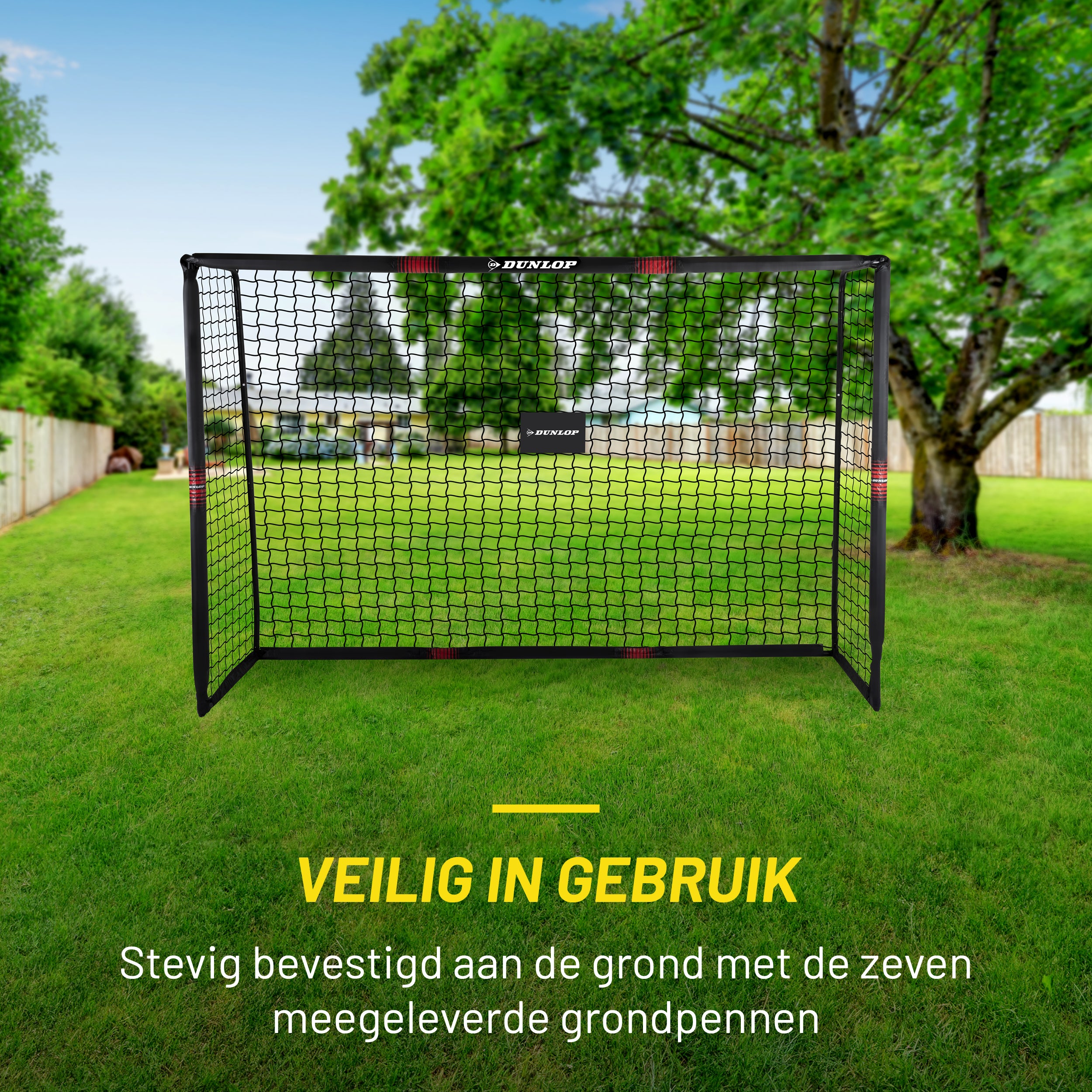 De Dunlop voetbalgoal bestaat uit een metalen frame. Hierdoor is het doel uiterst stevig en zelfs weersbestendig. Met de bijgeleverde grondpinnen kun je de goal stevig aan de grond bevestigen zodat deze zelfs bij de hardste doeltrappen overeind blijft staan.