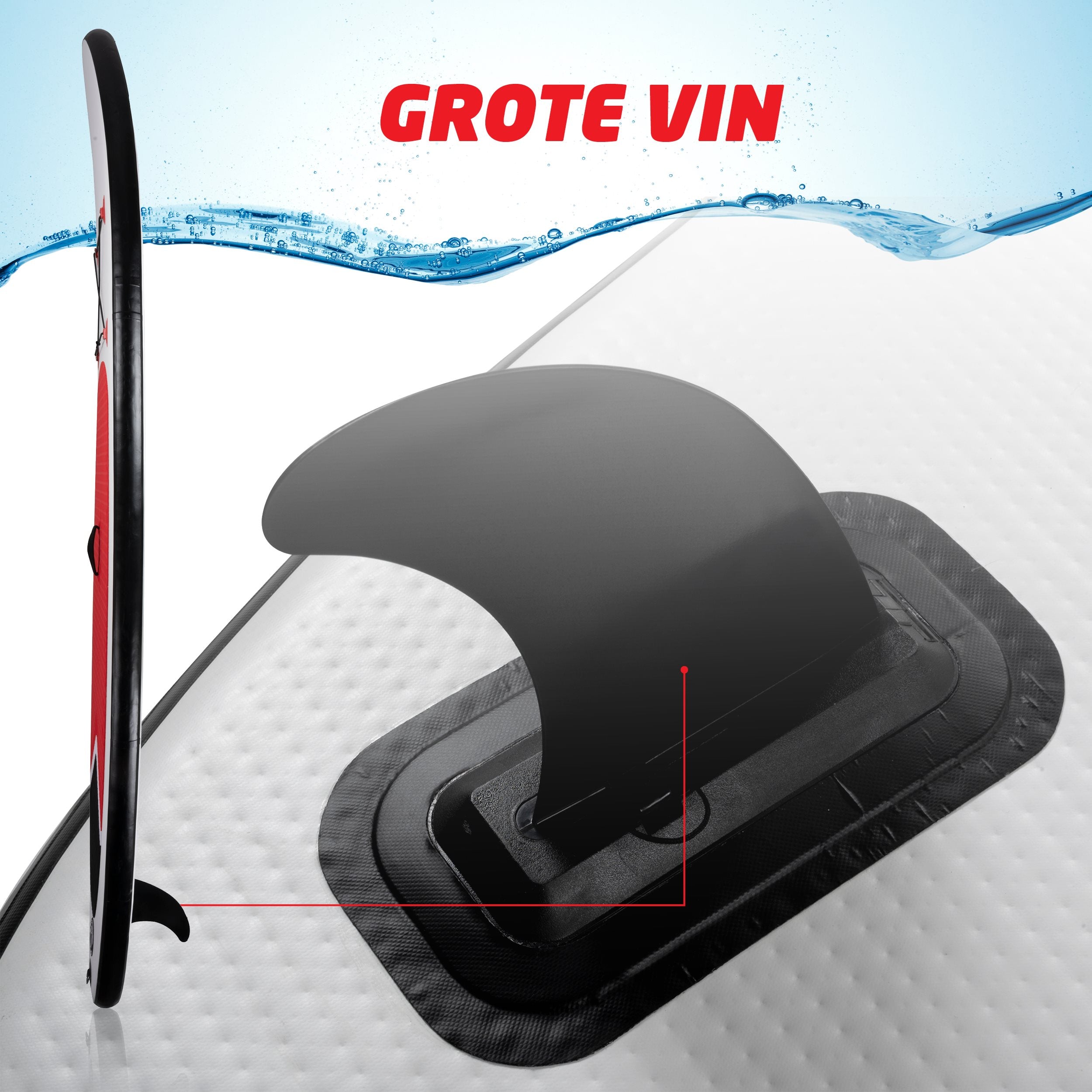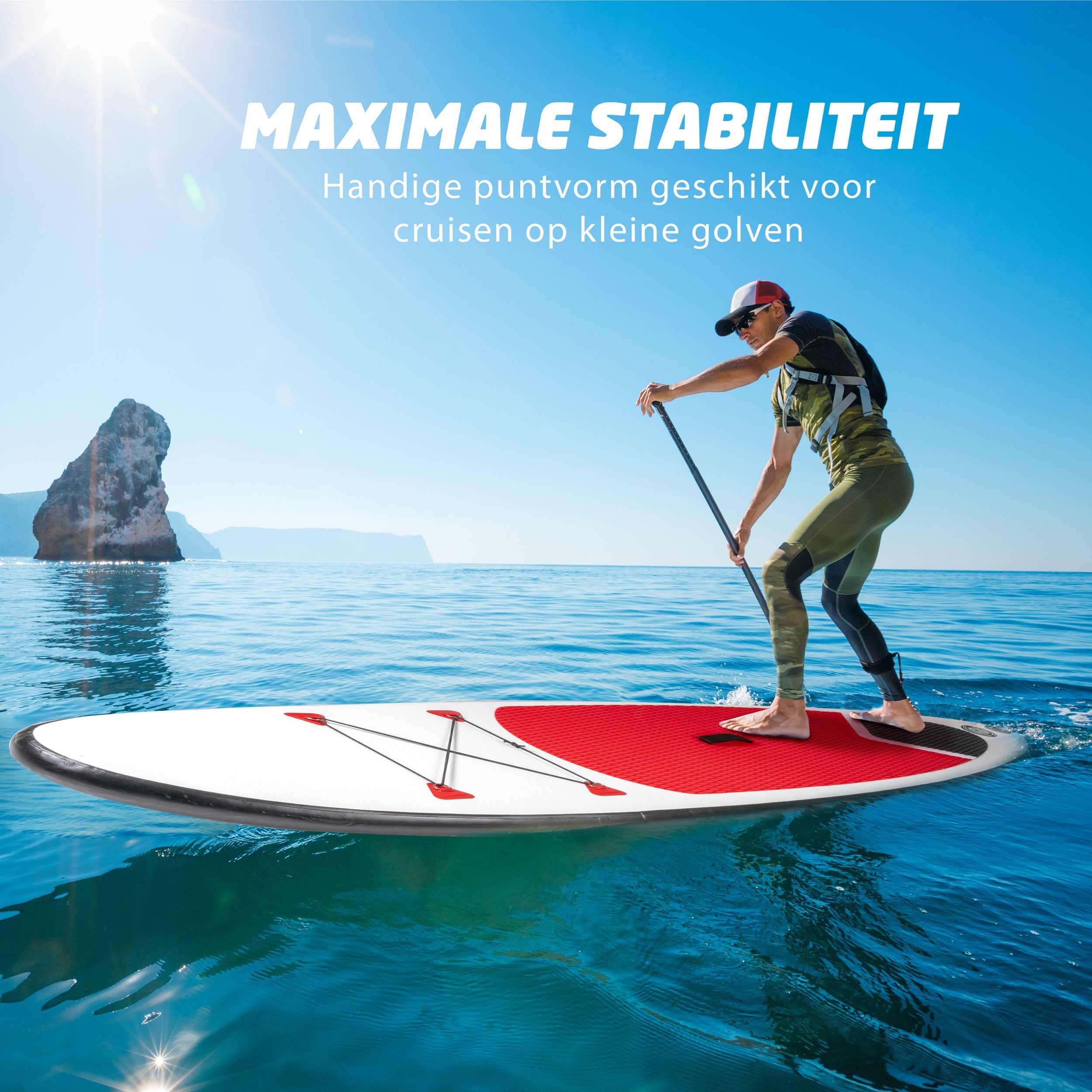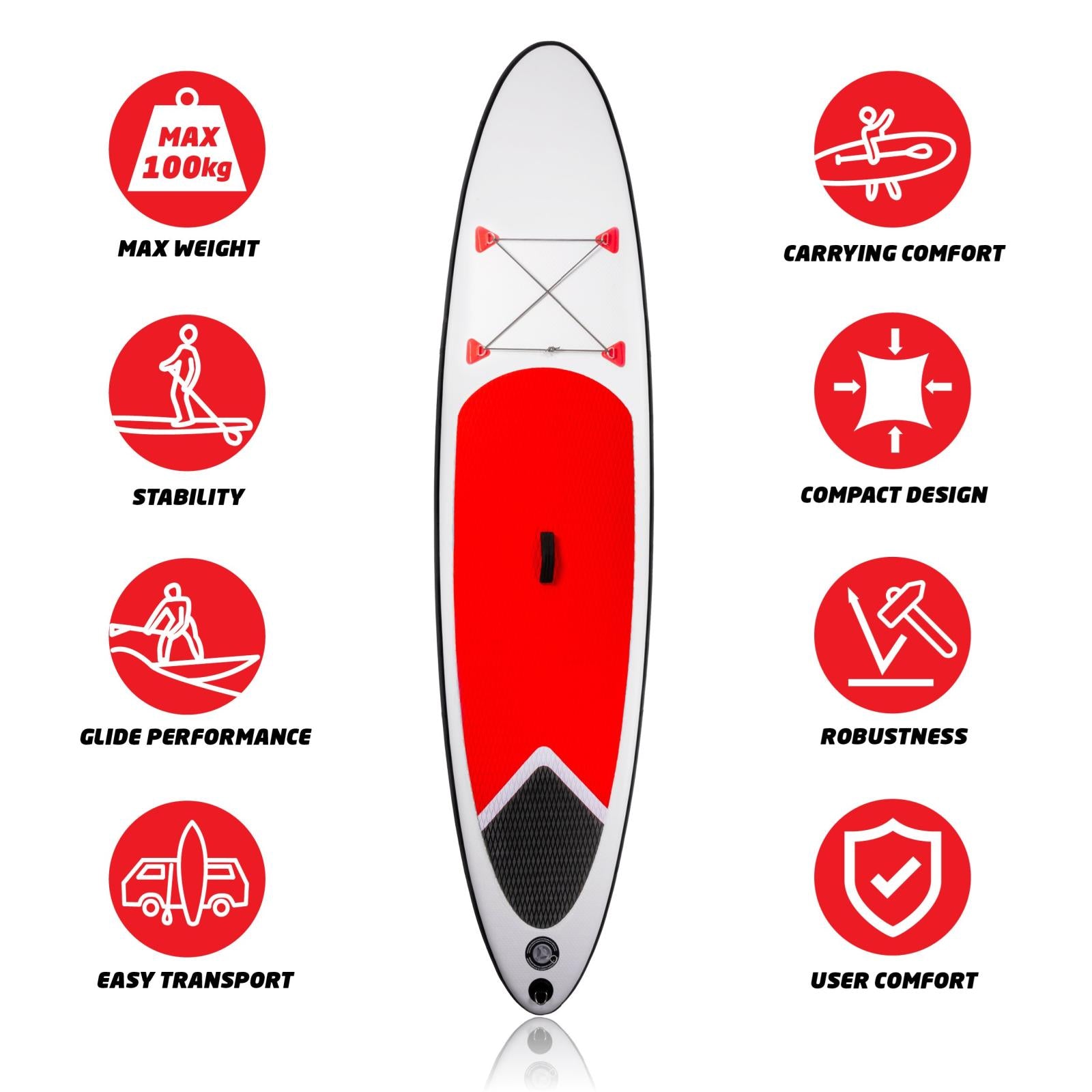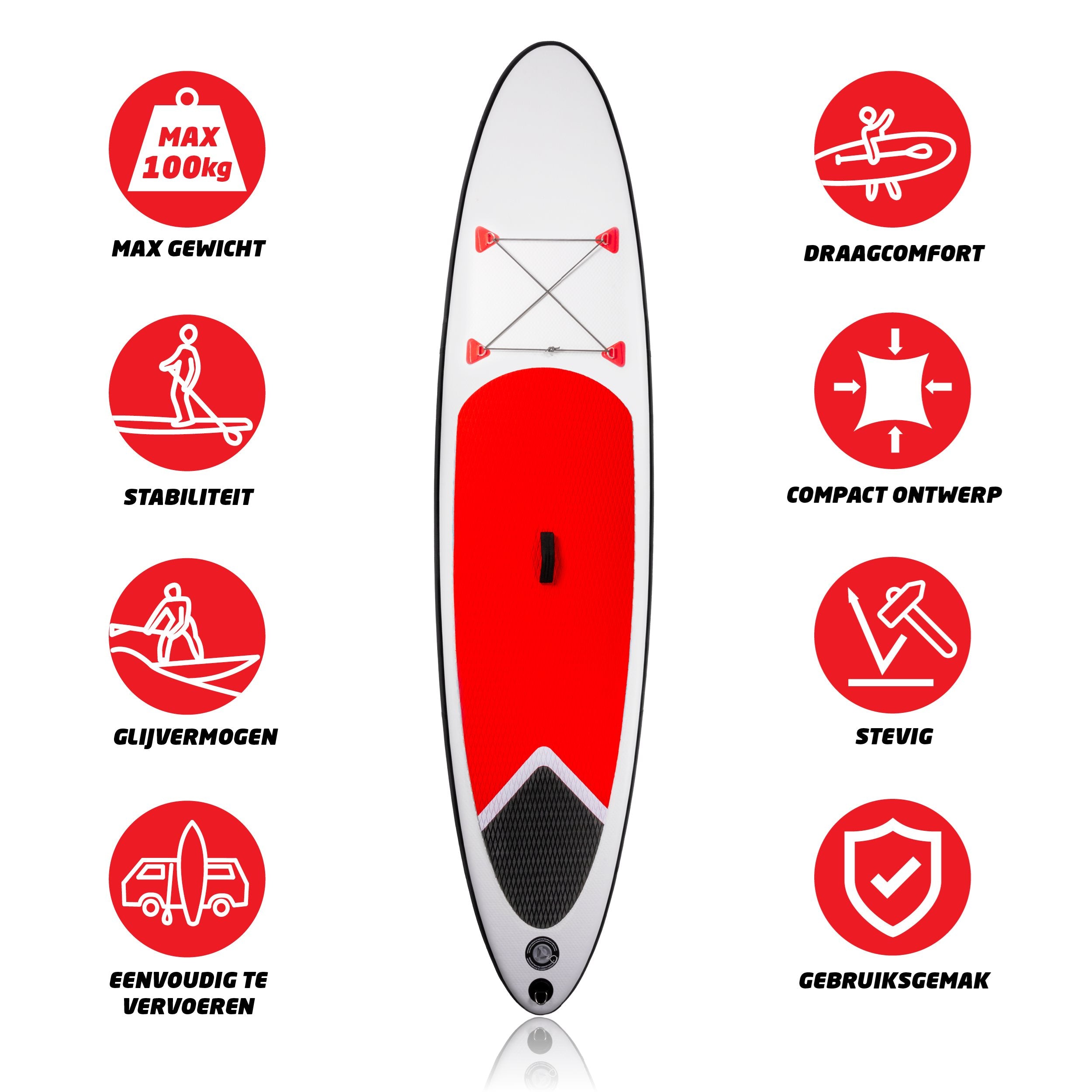 Het opblaasbare SUP board wordt als complete set geleverd. Hierdoor is het paddle board perfect voor zowel beginnende als gevorderde Stand Up Paddle boarders. In de set vindt je een opblaasbaar SUP board met bijbehorende rugzak, een pomp om je supboard mee op te pompen, een in lengte verstelbare SUP peddel om je paddle board door het water te verplaatsen en een complete reparatie kit voor wanneer het SUP board beschadigt raakt. Omdat de bijgeleverde SUP peddel in lengte verstelbaar is kun je hem afstellen naar de voor jou perfecte hoogte. Met behulp van de handpomp heb je het paddle board binnen maximaal 6 minuten volledig opgeblazen. Daarnaast zit er op het paddle board een handig handvat waarmee je hem gemakkelijk verplaatst, bungee touwen op de neus om hem snel uit het water te trekken en een grote vin aan de onderzijde waardoor het SUP board nog makkelijker door het water glijd.