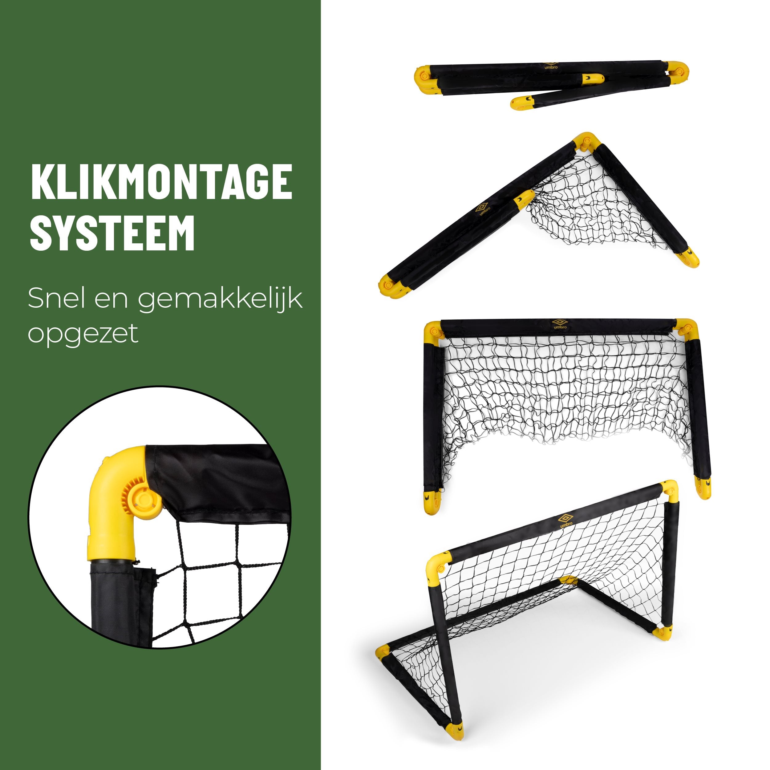 Het Umbro voetbaldoel wordt volledig gemonteerd geleverd. Het enige wat je hoeft te doen is het doel uit de doos halen en hem vervolgens open klappen met behulp van de scharnieren in de hoeken. Gebruik je de goal buiten? Veranker hem dan stevig aan de grond met behulp van de bijgeleverde metalen haken. Hierdoor blijft het goaltje zelfs bij de hardste doeltrappen overeind staan. Wanneer je de voetbalgoal niet gebruikt vouw je hem simpelweg weer op. Zo kun je hem compact opbergen en zelfs meenemen op vakantie.