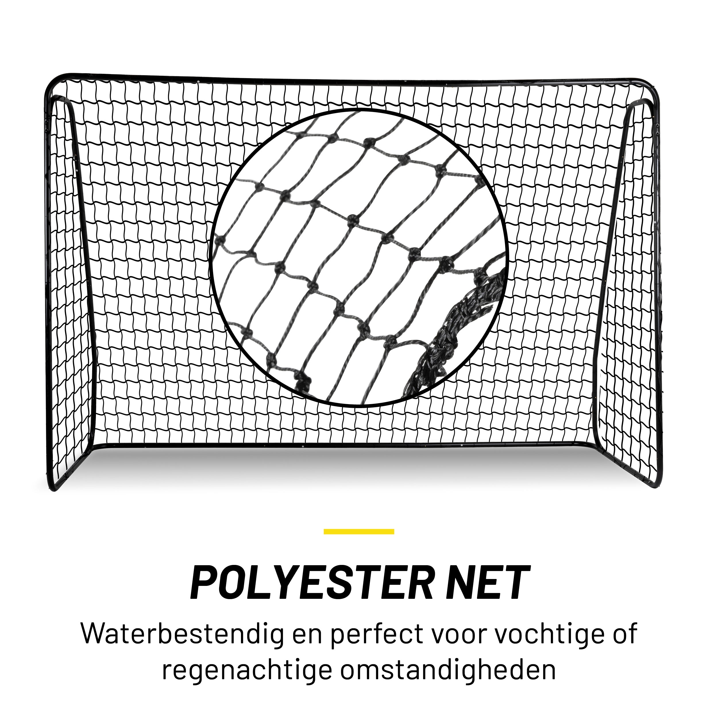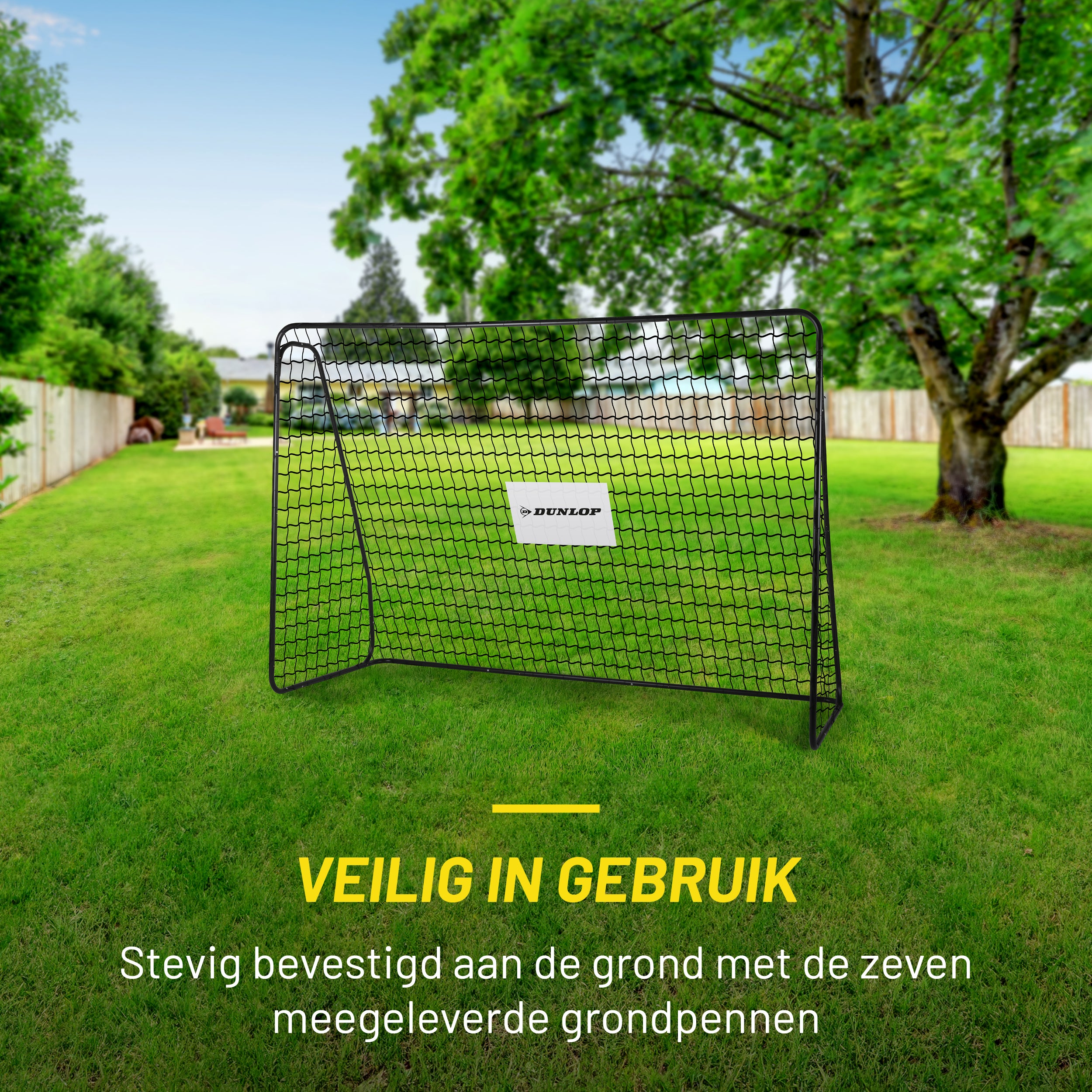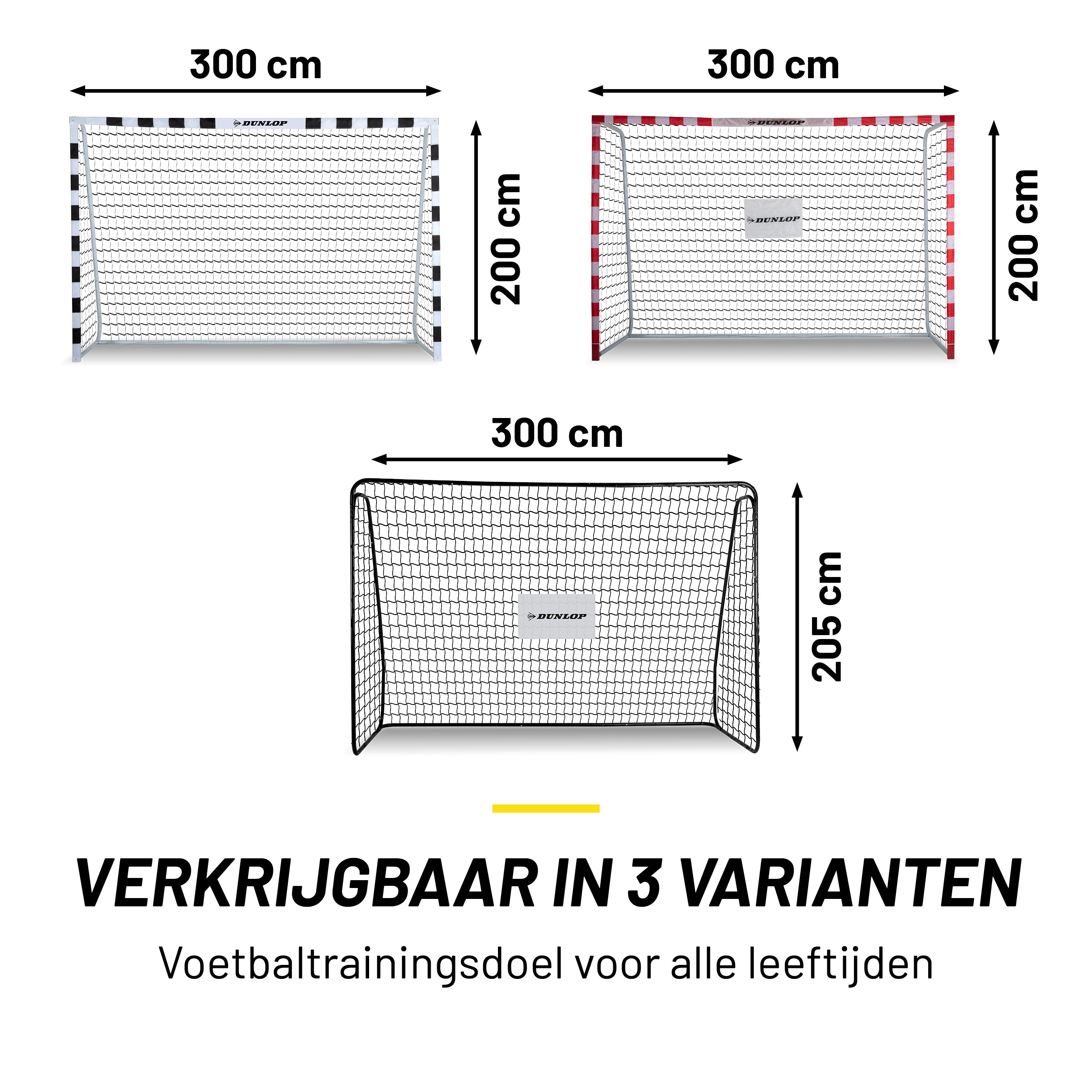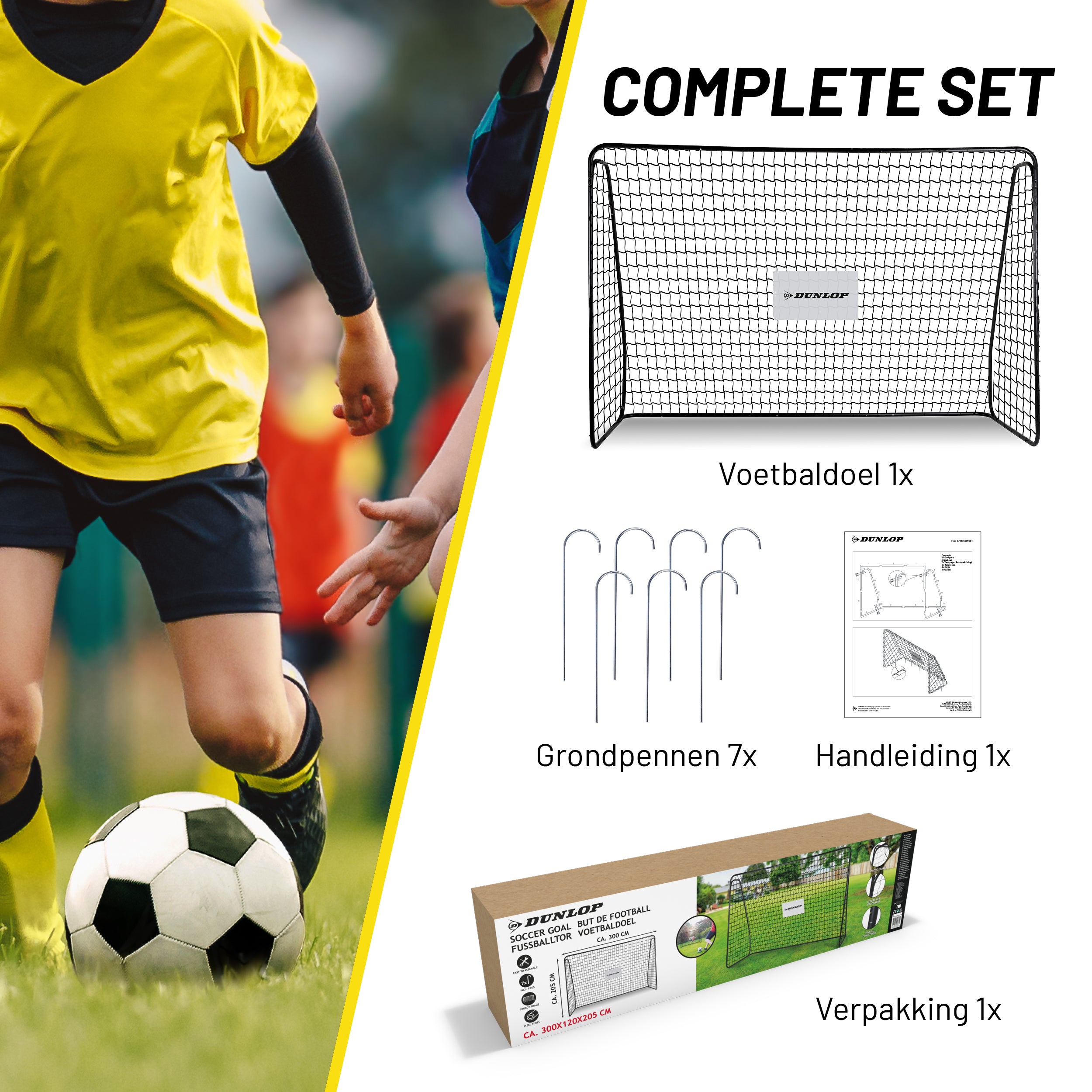 Train je voetbalskills met dit stevige voetbaldoel van Dunlop. De goals is 300 centimeter lang, 205 centimeter breed en 120 centimeter hoog. Hiermee is het de perfecte goal voor voetbal liefhebbers van verschillende leeftijden. Je zet de voetbaldoel makkelijk en snel op middels een kliksysteem. Dankzij het materiaal van staal en 7 grondhaken staat de goals stevig op de grond en valt hij niet zomaar om. De palen van het voetbaldoel zijn omringd met EPE-schuim. Mocht de goal dus toch omvallen, dan beschadigd hij minder snel de ondergrond.