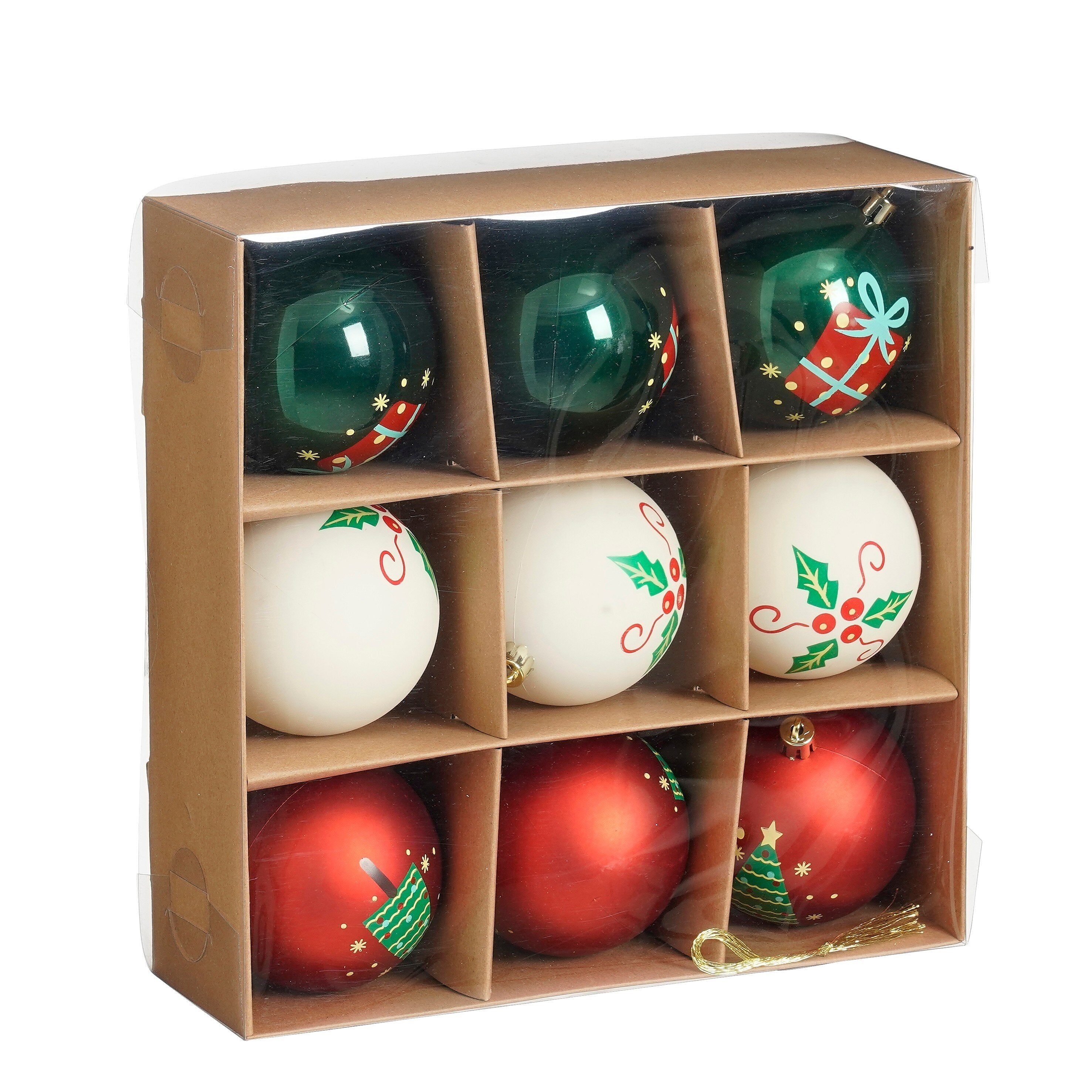 Deze kerstballen van Mica Decorations brengen een traditionele sfeer in huis. De set bevat 9 ballen in wit, rood en groen, elk voorzien van een eenvoudig, feestelijk dessin: hulstblaadjes, kerstcadeaus en dennenbomen. De kerstballen zijn gemaakt van gerecycled polystyreen en hebben een diameter van 8 cm. Dankzij het lichte materiaal zijn ze veilig en gemakkelijk op te hangen. Touwtjes zijn inbegrepen, dus je kunt direct beginnen met versieren. Na de feestdagen berg je ze eenvoudig op in de bijgeleverde bewaarverpakking.