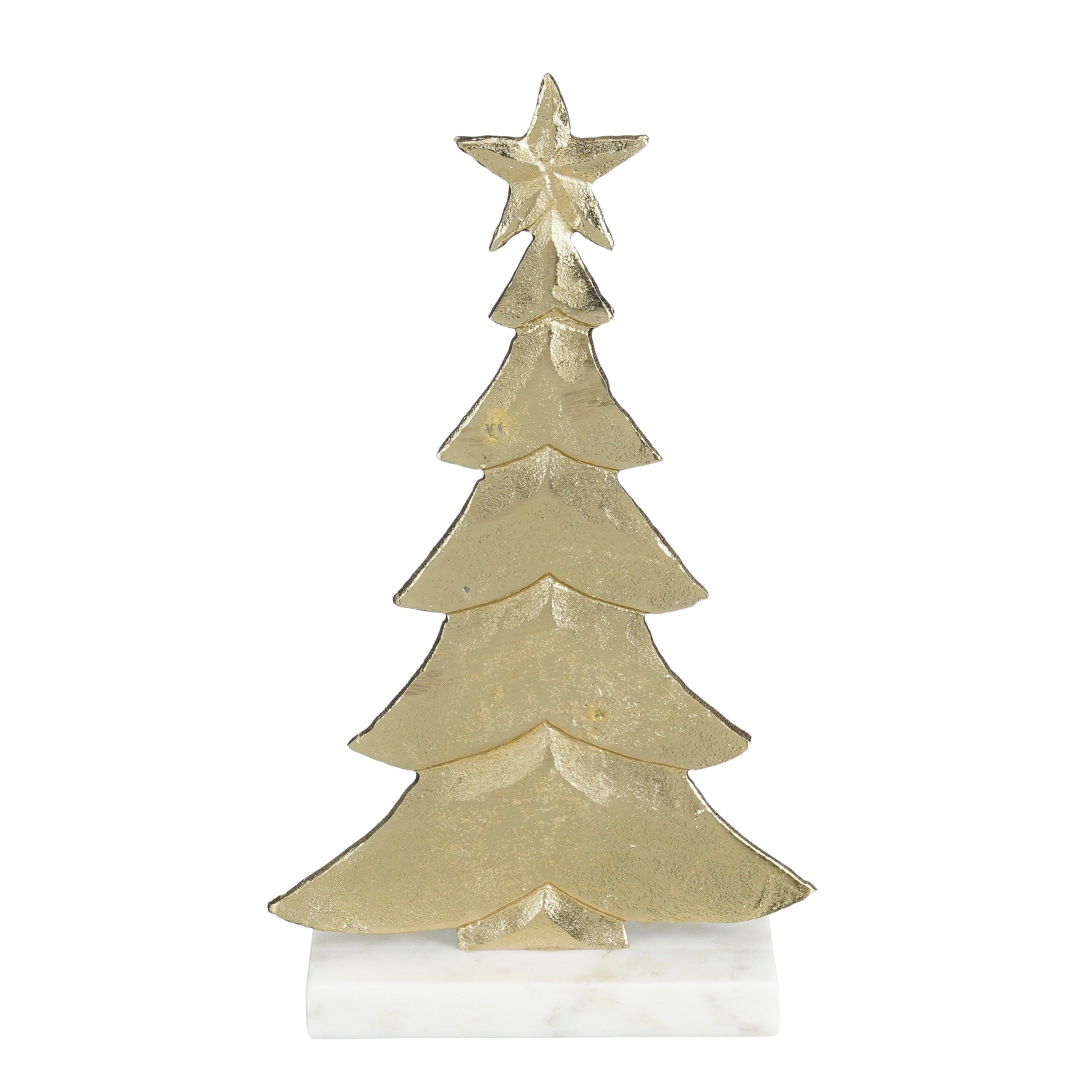 Deze stijlvolle decoratie kerstboom van Mica Decorations brengt een chique touch in huis. De boom is gemaakt van champagnekleurig aluminium en staat stevig op een voet van wit marmer. De combinatie van metaal en natuursteen geeft deze kerstdecoratie een luxe uitstraling die perfect past bij een moderne of klassieke kerststijl. Zet hem op de vensterbank, het dressoir of de schouw voor een feestelijk accent dat meteen opvalt. De decoratie kerstboom heeft een lengte van 18 cm, een breedte van 7 cm en een hoogte van 32 cm.