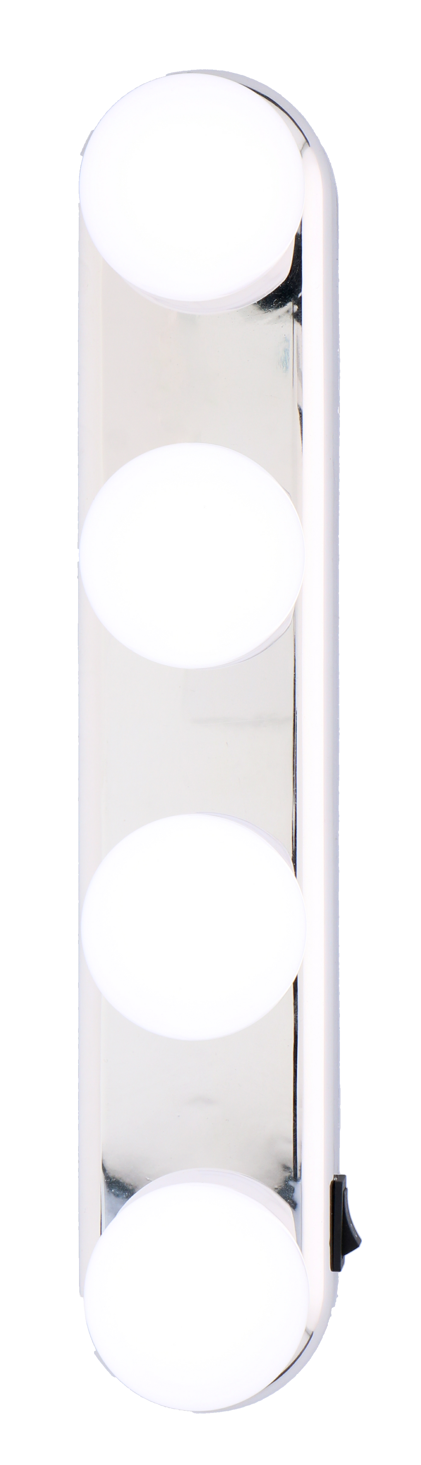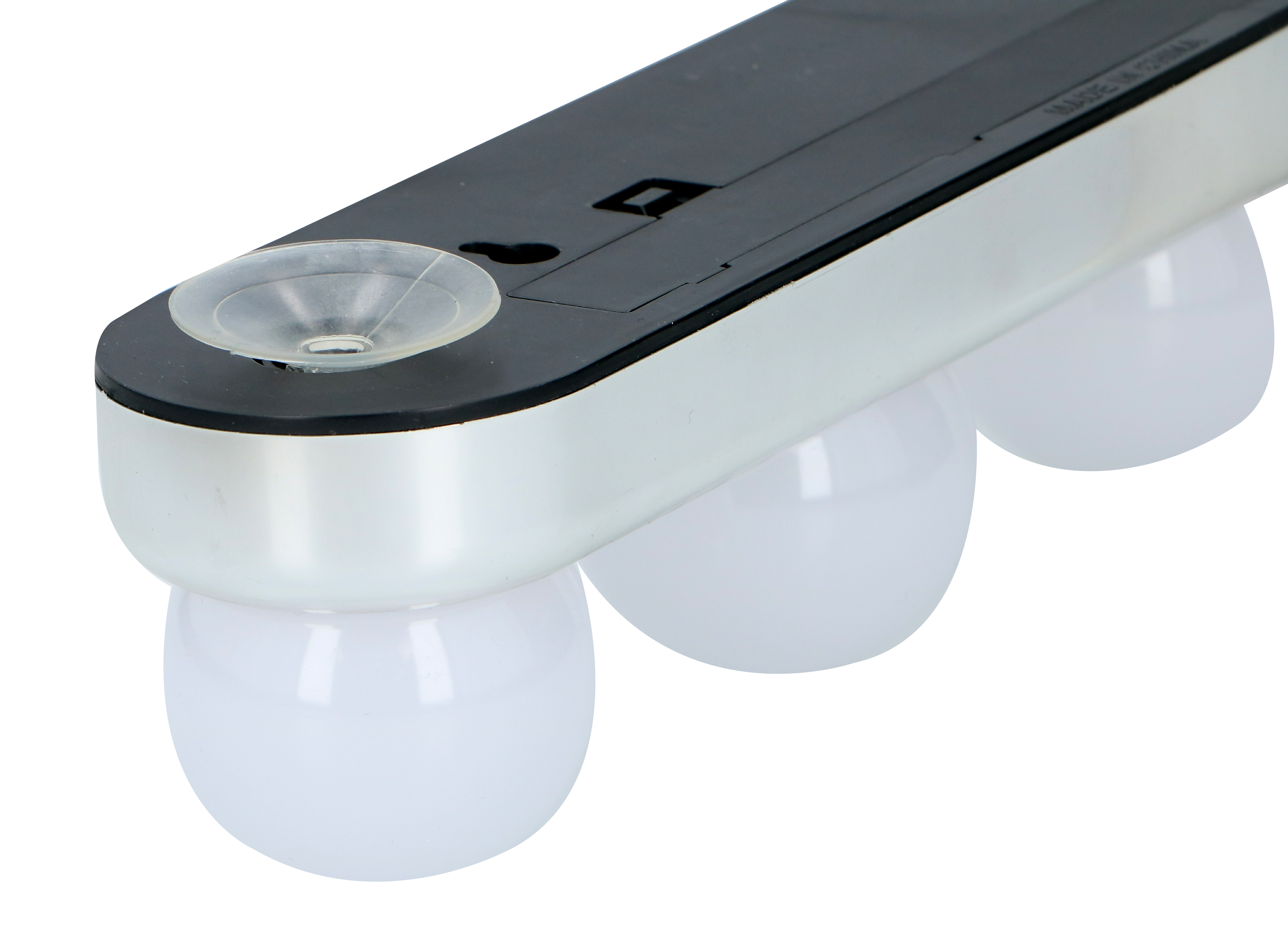 De make-up-lamp bestaat uit een zilverkleurige kunststof basis waarop 4 witte bollen met helder witte LED's zijn bevestigd. Aan de zijkant bevindt zich de aan- en uitknop. De spiegelverlichting werkt op 4 AA-batterijen die niet zijn inbegrepen. Aan de achterkant zitten 2 stevige zuignappen waarmee je de spiegellamp op je spiegel plakt.