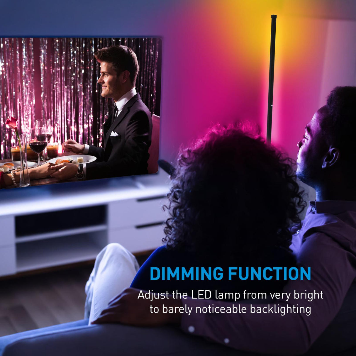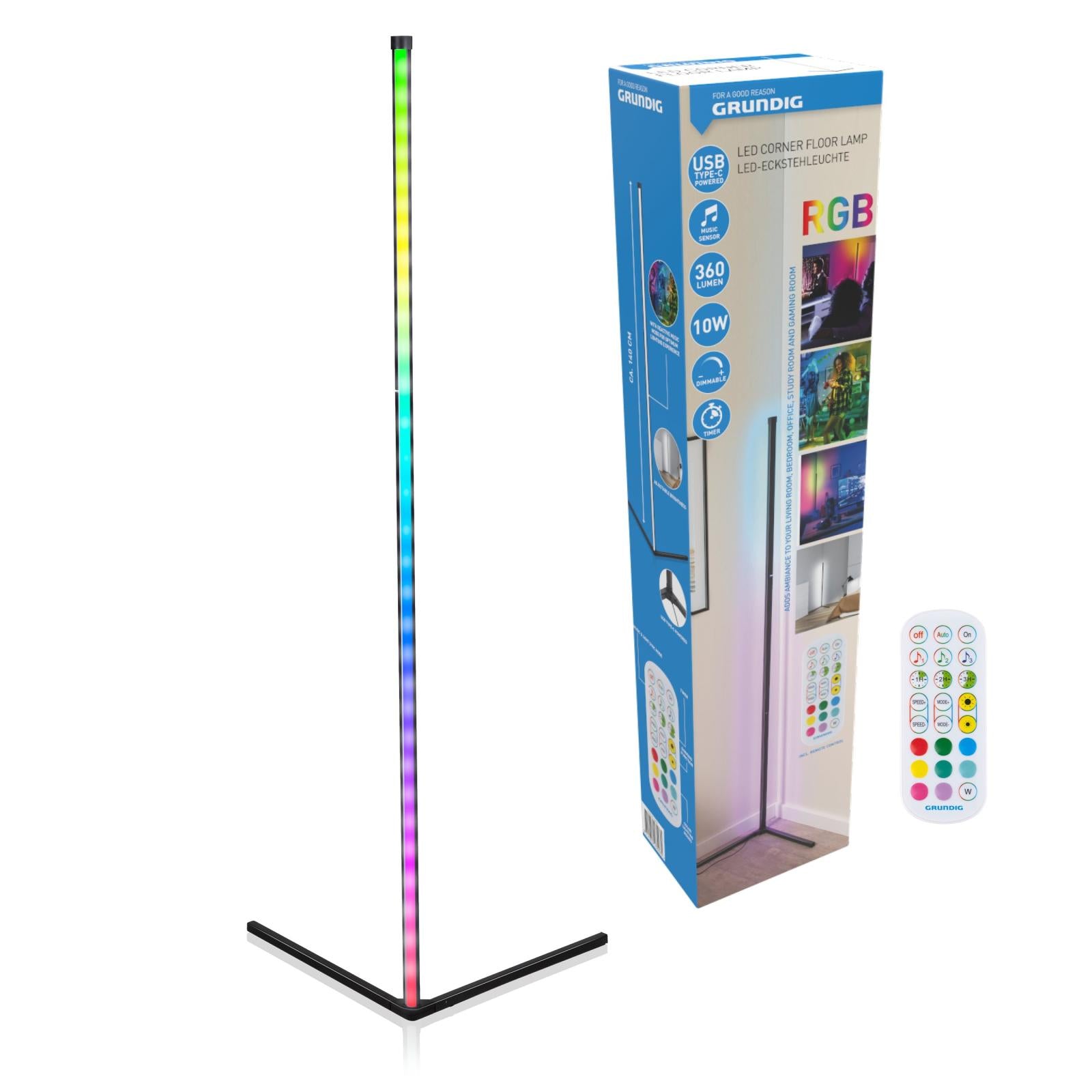 Tover je woonkamer om tot een thuis bioscoop of discotheek met deze LED hoeklamp van Grundig. De hoeklamp wordt geleverd met een houder waarin je hem gemakkelijk en stevig kunt vastzetten. Met behulp van de meegeleverde afstandsbediening zet je hem vervolgens aan in een van de verschillende RGB-kleurenopties of naar simpel en elegant wit licht. Daarnaast kun je met de afstandsbediening het licht dempen, de knippersnelheid van het licht bepalen en ook de timer voor de hoeklamp instellen. Een andere leuke feature van deze LED hoeklamp is dat hij over een muzieksensor beschikt. Dit betekent dat het licht wordt aangepast op het type muziek dat je afspeelt in de buurt van de lamp. Je laad de lamp gemakkelijk op door middel van de meegeleverde USB-C oplader.