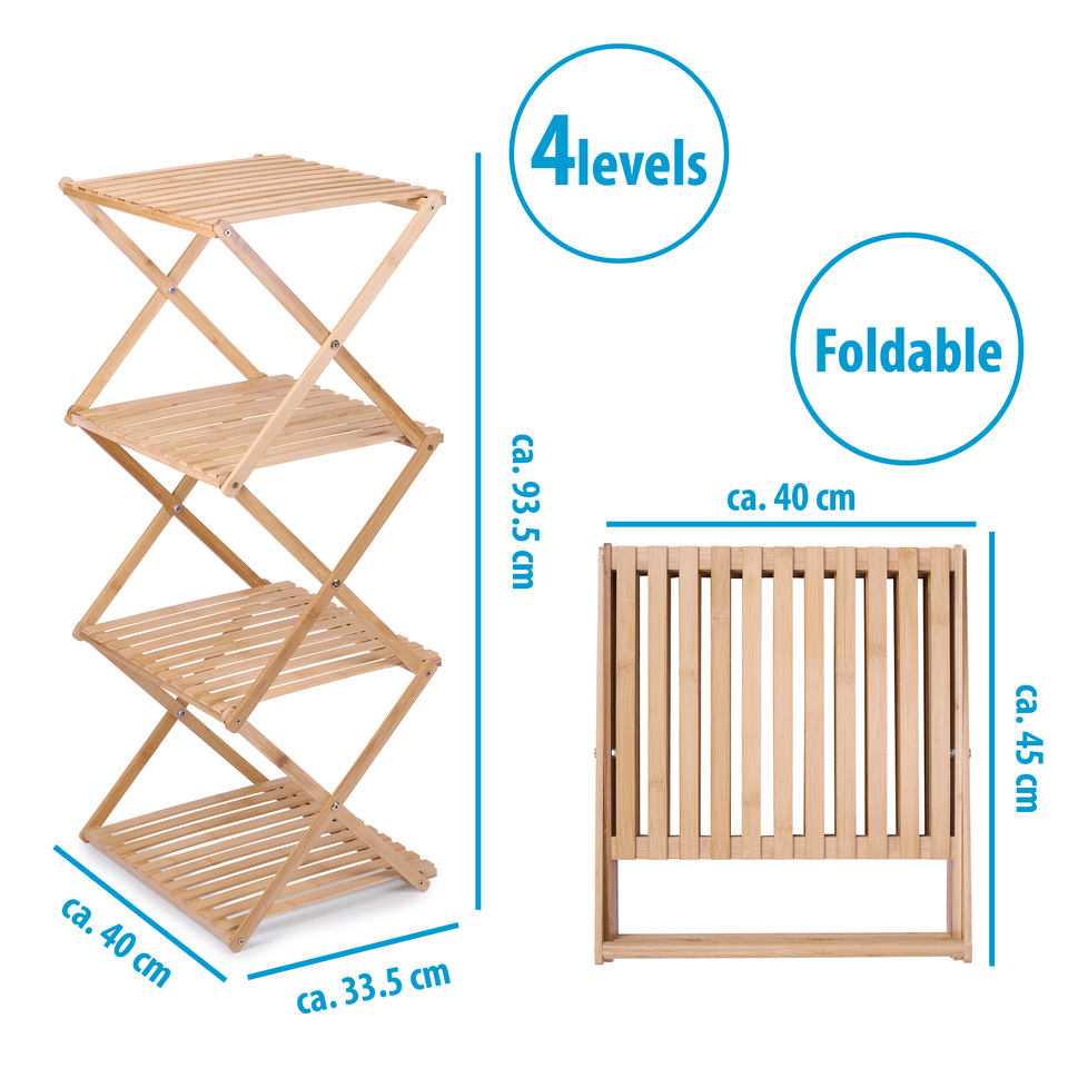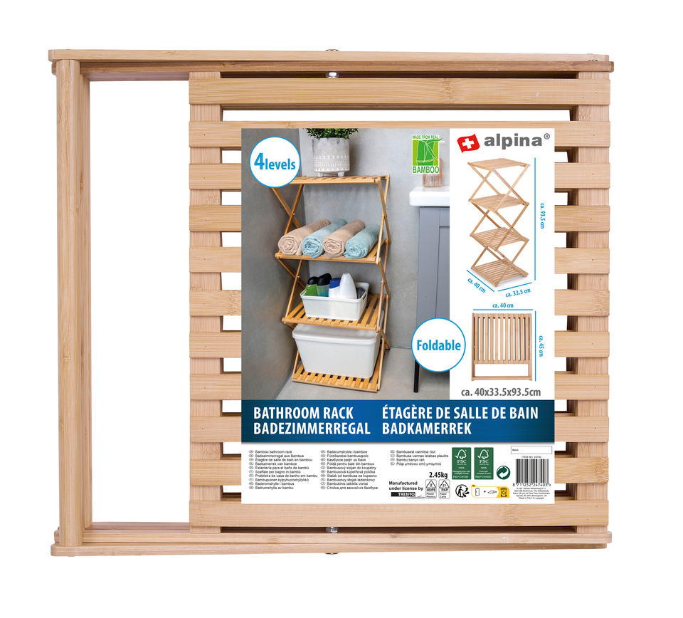 De alpina badkamerkast van bamboe heeft in de hoogte 4 lagen. Dankzij de 4 niveau's op dit badkamerrek kun je verschillende items makkelijk opslaan. Denk daarbij aan handdoeken, shampoo, conditioner, wasgel en andere badkamer accessoires. Alles ligt op een plek, is georganiseerd en makkelijk te pakken wanneer je het nodig hebt voor het douchen, je ochtend- en je avondroutine. Maar het badkamerrek is niet alleen ideaal voor gebruik in de badkamer. Naast badkamerrek kun je de kast ook op andere plekken in huis goed gebruiken. Denk daarbij bijvoorbeeld aan de keuken om je keukenvoorraad op te slaan, of als extra kledingkast in de kleed- of slaapkamer. Het rek is opvouwbaar en gemaakt van 100% bamboe materiaal.