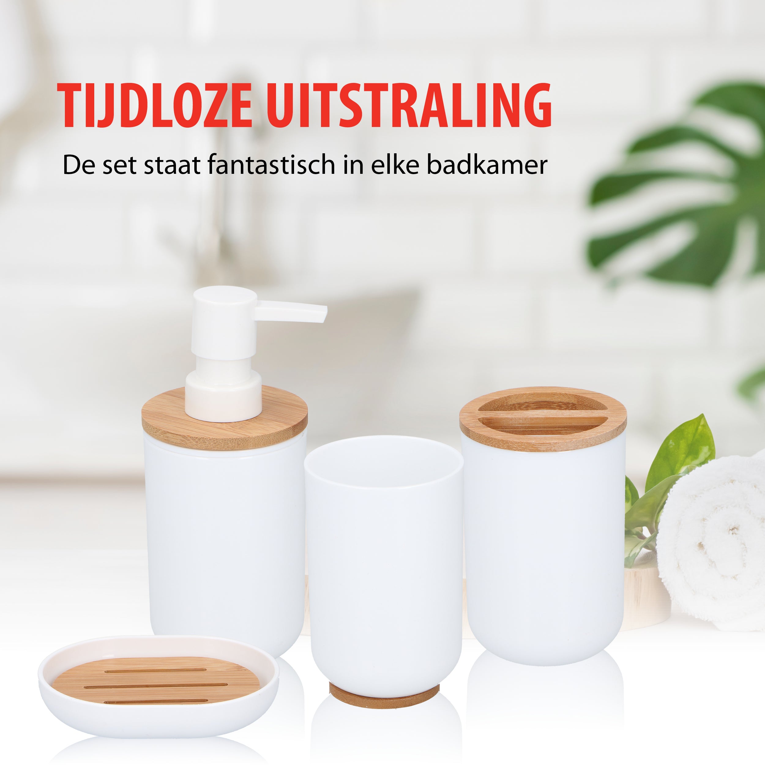 Door het tijdloze ronde design van wit kunststof met hout staat deze set fantastisch in elke badkamer. De set bestaat uit een prullenbakje, een toiletborstel, een zeepdispenser, een tandenborstelhouder, een zeepbakje en een bekertje.