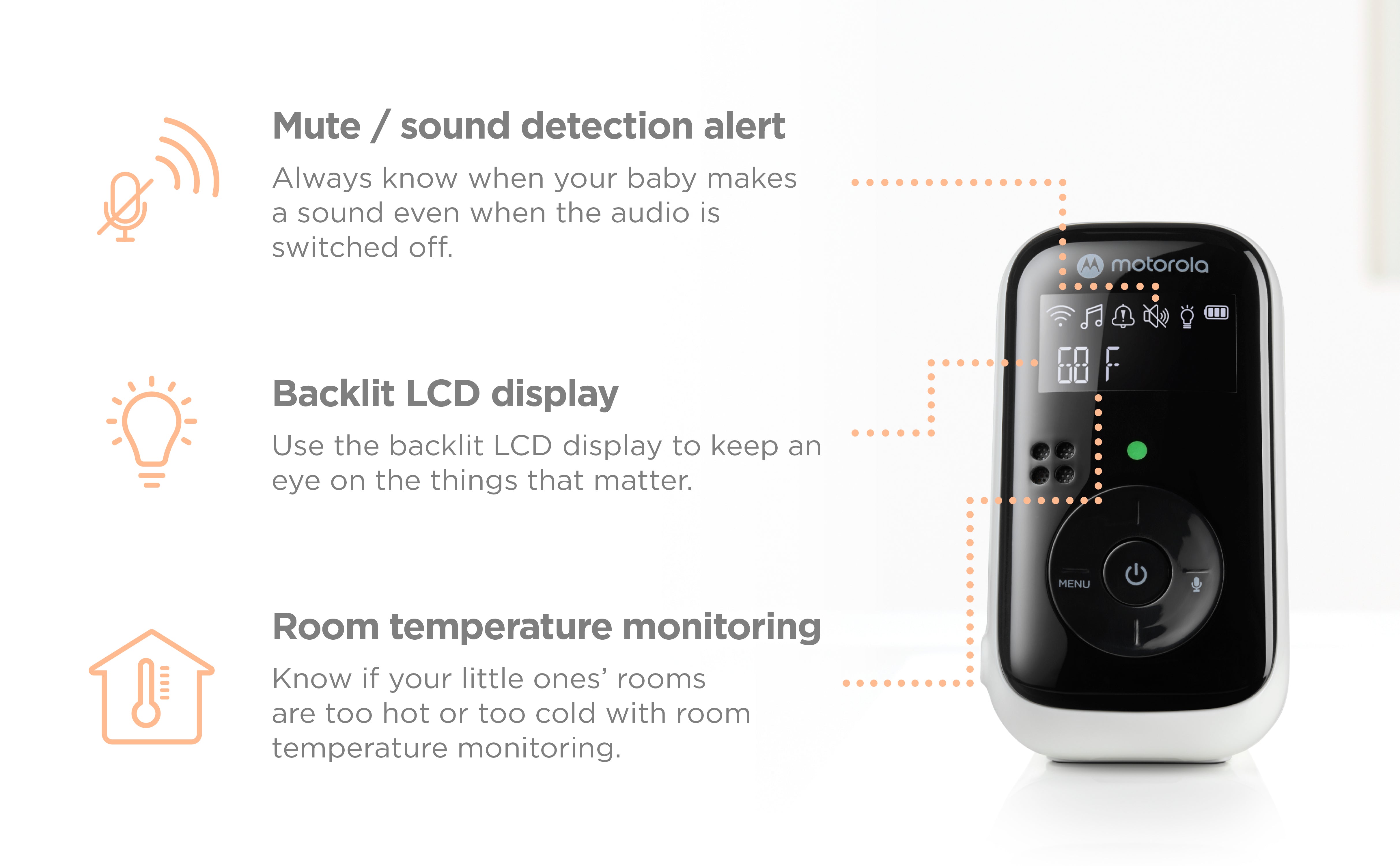 Jij hoeft je geen zorgen te maken dat je een geluidje mist van je baby. De hoogsensitieve microfoon pikt elk geluidje op, ook wanneer het geluid van de ouder unit uit staat. Door het aanwezige lichtindicatielampje word je namelijk ook op de hoogte gehouden zonder dat je je baby kunt horen. De babyphone en ouder unit kunnen tot 300 meter bereik met elkaar behouden, binnenshuis is dit door obstakels gemiddeld 50 meter. Genoeg om door het hele huis in connectie met je kindje te blijven.