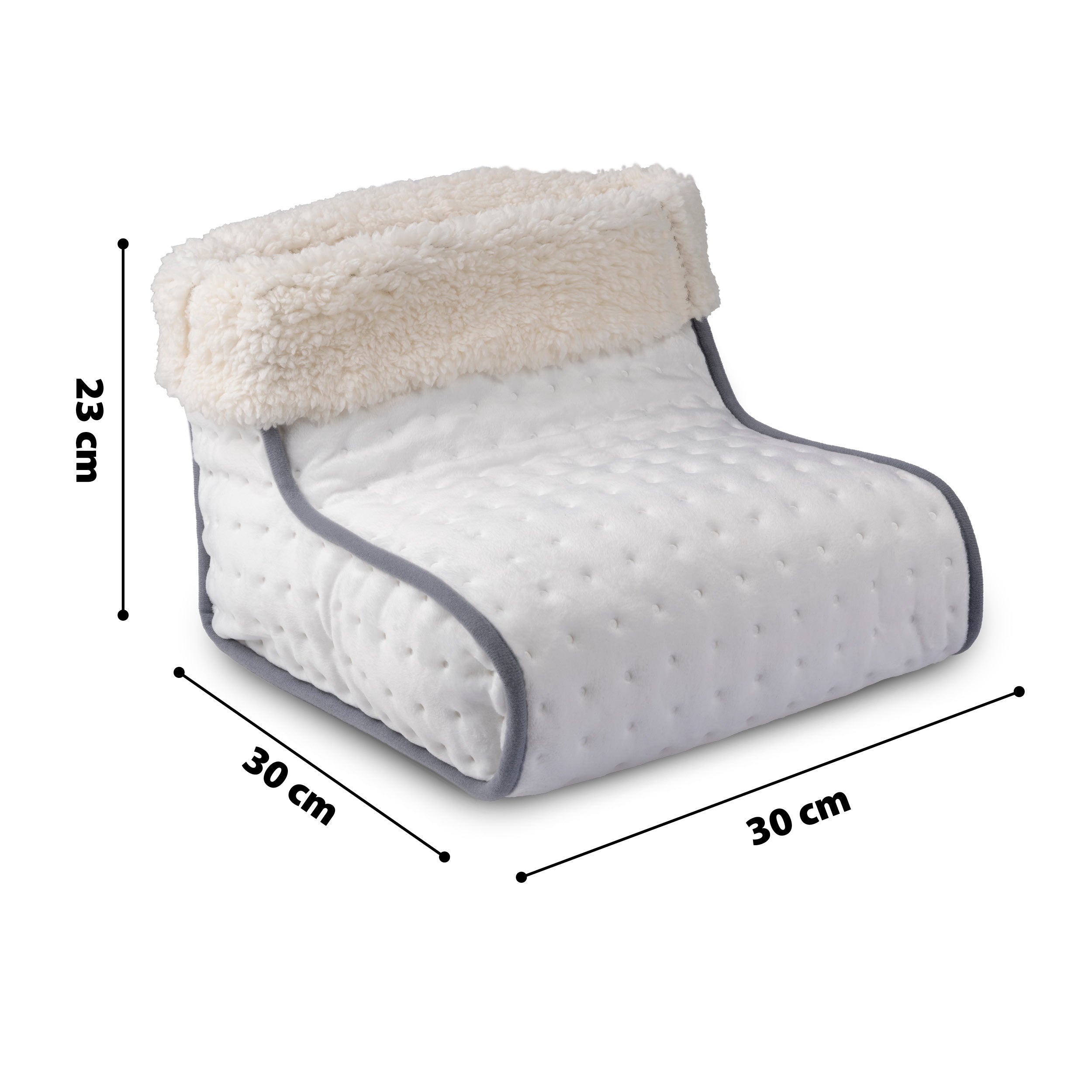 Met de elektrische voetverwarmer van alpina in wolwit heb je heerlijke warme voeten. De voetverwarmer is in feite een reuze pantoffel waar je beide voeten gelijktijdig in kunt steken. Dankzij de fleece binnenlaag en elektrische verwarming zijn je voeten niet alleen warm, maar ook nog eens comfortabel. De ideale gadget voor wanneer je thuiskomt van een winterse wandeling, om onder je bureau te gebruiken tijdens het thuiswerken of voor 's avonds op de bank. De fleece binnenlaag kun je loskoppelen van de voetenwarmer en wassen in de wasmachine.