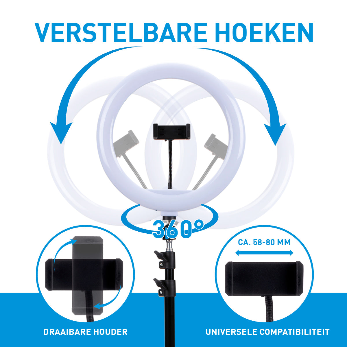 Ook voor het maken van een foto of video in verschillende hoeken is de Grundig ringlamp ideaal. De hals is namelijk flexibel, draait maar liefst 360°, en plaats je daarom gemakkelijk in verschillende posities. Het bijgeleverde statief is daarnaast in hoogte verstelbaar tot een lengte van maar liefst 195 centimeter. Zo plaats je jouw smartphone gemakkelijk in de door jou gewenste hoek of positie. De telefoonhouder is universeel te gebruiken voor telefoons varierend van 58 tot 85 millimeter.