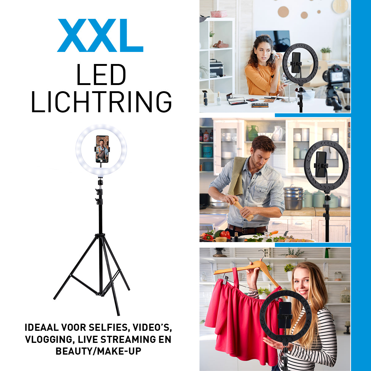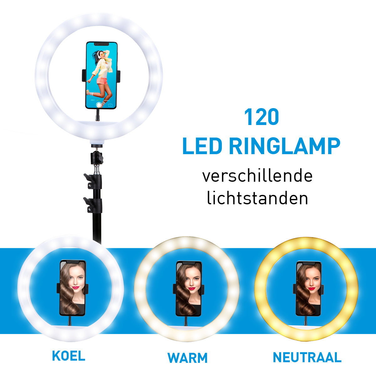 Verbaas vriend en vijand met jouw fotografie skills dankzij deze Grundig selfie ringlamp. Deze ringlight of TikTok lamp beschikt over maar liefst 120 LED lampjes die je in 3 verschillende soorten wit licht in kunt stellen. Daarnaast wordt de ringlamp geleverd met een statief dat je in hoogte aan kunt passen tot maar liefst 195 centimeter. Op de ringlamp met statief zit ook een telefoonhouder gemonteerd waarop je telefoons kunt plaatsen van minimaal 58 en maximaal 85 millimeter breed.
