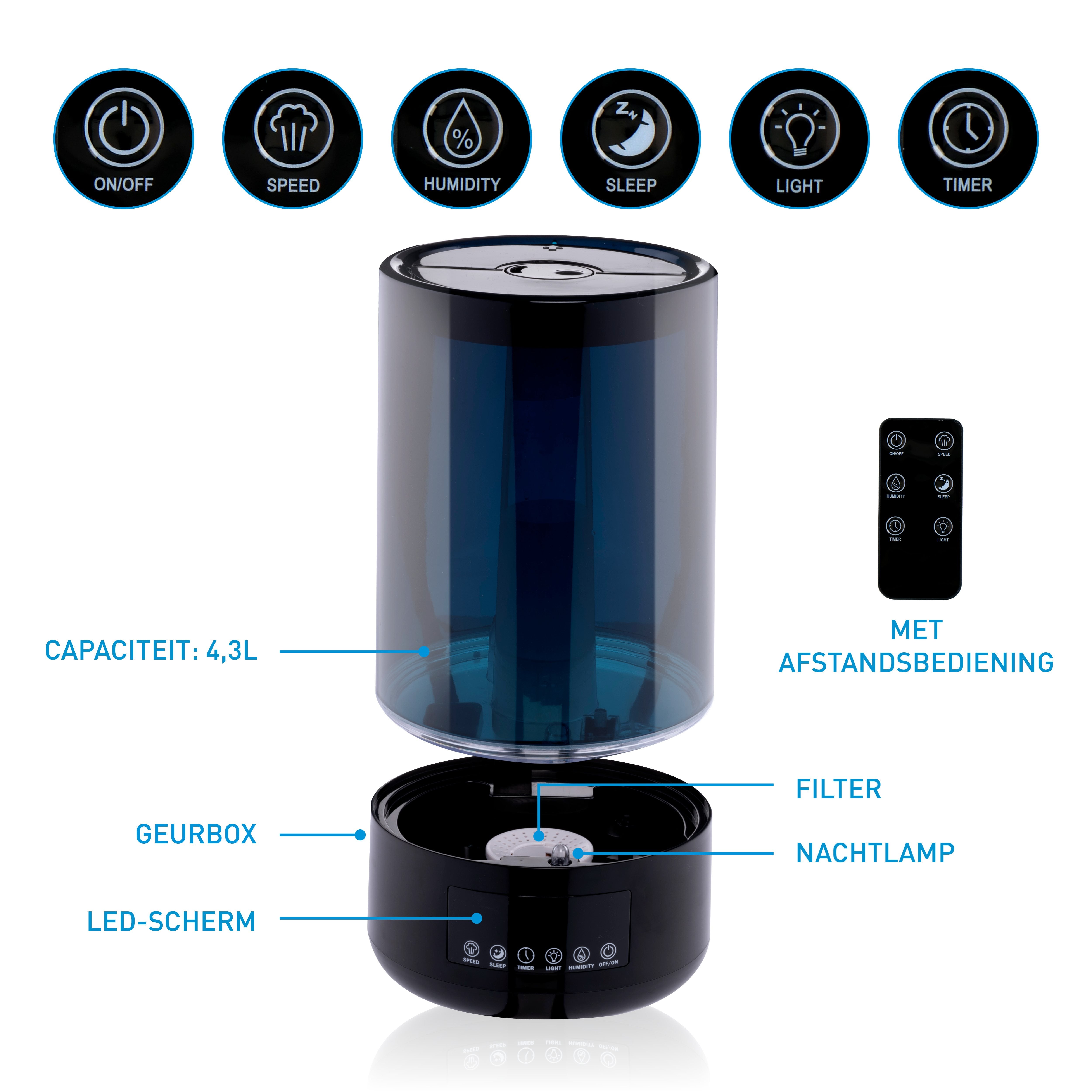 - Nevelafgifte instelbaar: 3 nevelstanden, licht, medium en krachtig