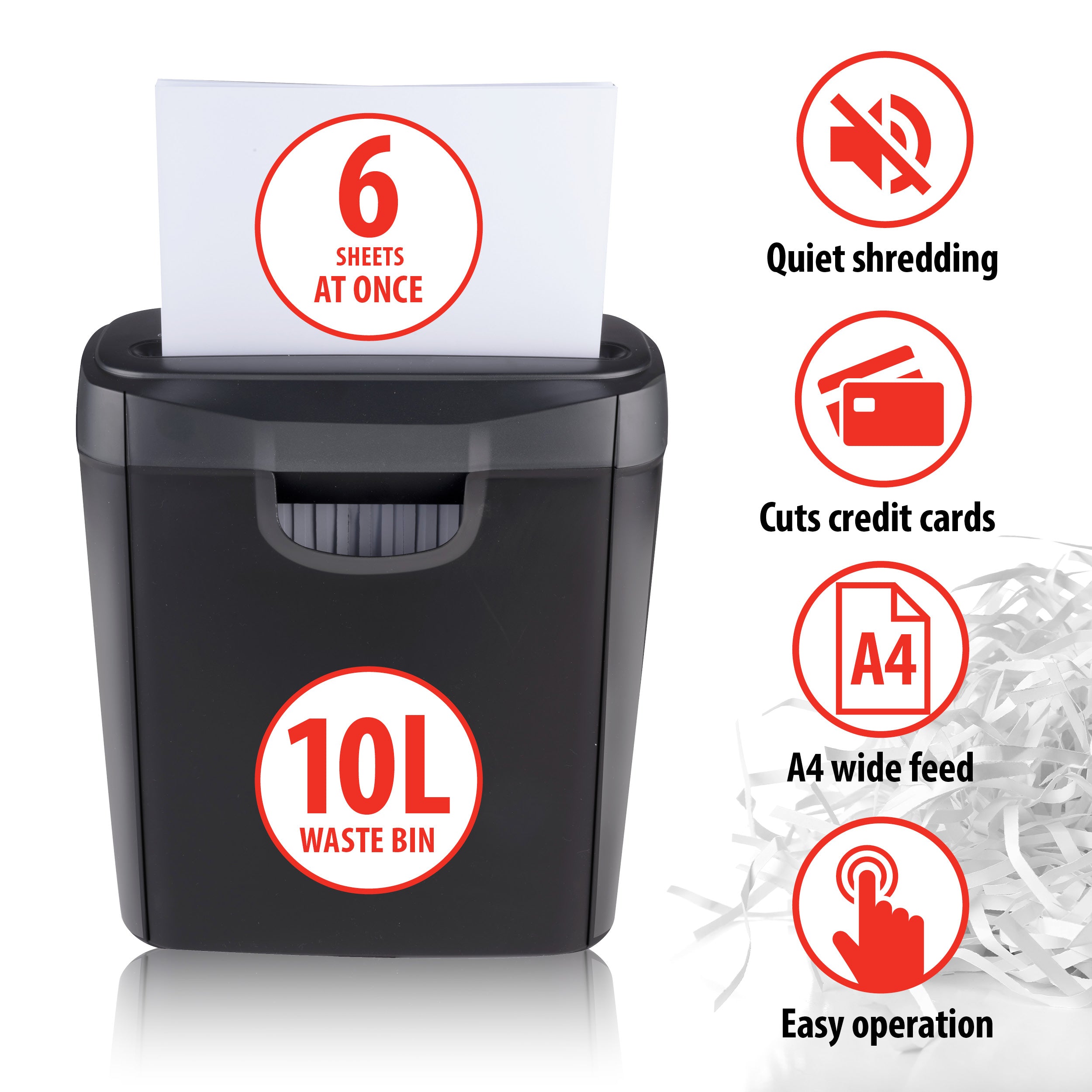 De automatische shredder versnijdt je papier in stroken. De snijstrip snijdt per keer 6 vellen van 80 gram A4-formaat. De kleine papierstrookjes vangt hij op onder de messen, in een opvangbak van 10 liter.